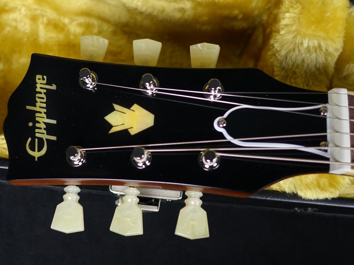 ヘッドストックにはGibsonスタイルの“オープンブック”デザインを採用し、EpiphoneロゴとGibsonクラウン・インレイをエイジド・マザー・オブ・パールで装飾。