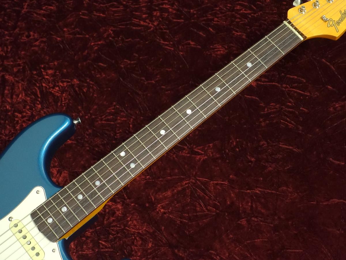 ボディーを覆う”Paradise Blue”はLake Placid Blueが経年変化で深みを増した特有の色味を再現しながらメタリックを強めたこだわりのオリジナルカラー。トップコートのニトロセルロースラッカーは最小限に抑えられ、ヴィンテージのような鳴りとルックスをより早く楽しめる仕様となっています。 本人実機からプロファイルされたネックは7.25インチラディアスのラウンドローズ指板に約41mmのナット幅と薄めの1965 “C”シェイプとなっており、ヴィンテージの握り心地を忠実に再現しつつNarrow Tallフレットによりスムーズな演奏性を実現しています。