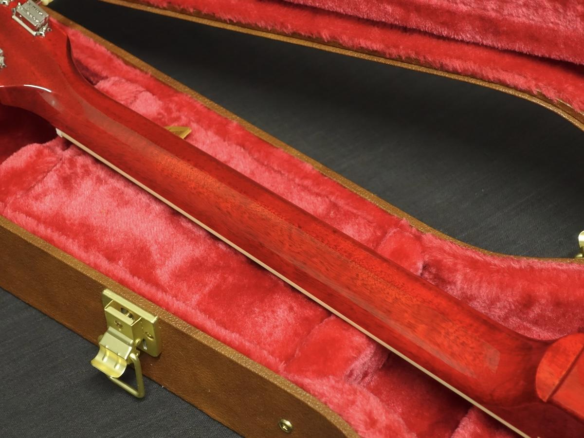 ノンウエイトリリーフのマホガニーボディ、トップ材にはカスタムショップグレードのフィギュアドメイプルを採用。写真でも杢の深みがレギュラーラインのものとは異なることがわかるかと思います。