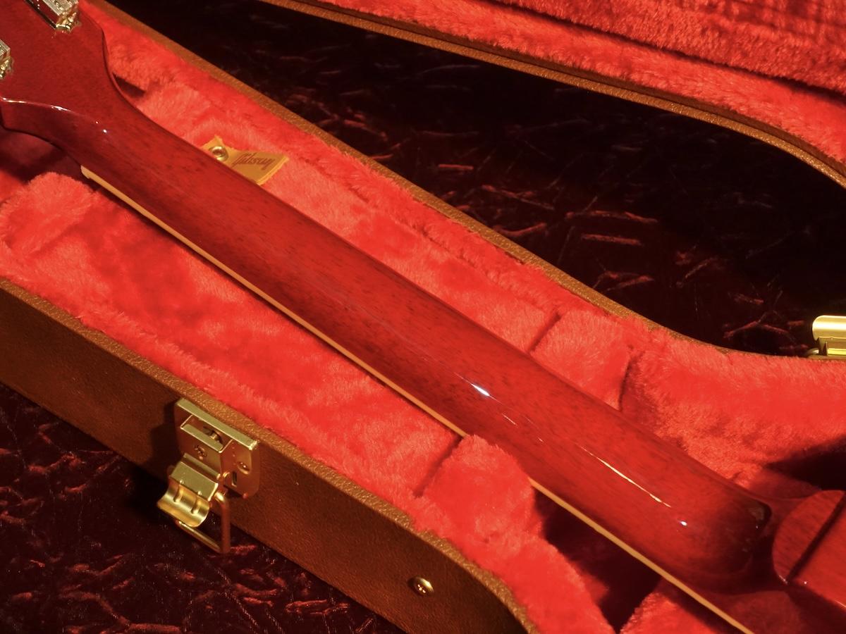 ノンウエイトリリーフのマホガニーボディ、トップ材にはカスタムショップグレードのフィギュアドメイプルを採用。写真でも杢の深みがレギュラーラインのものとは異なることがわかるかと思います。
