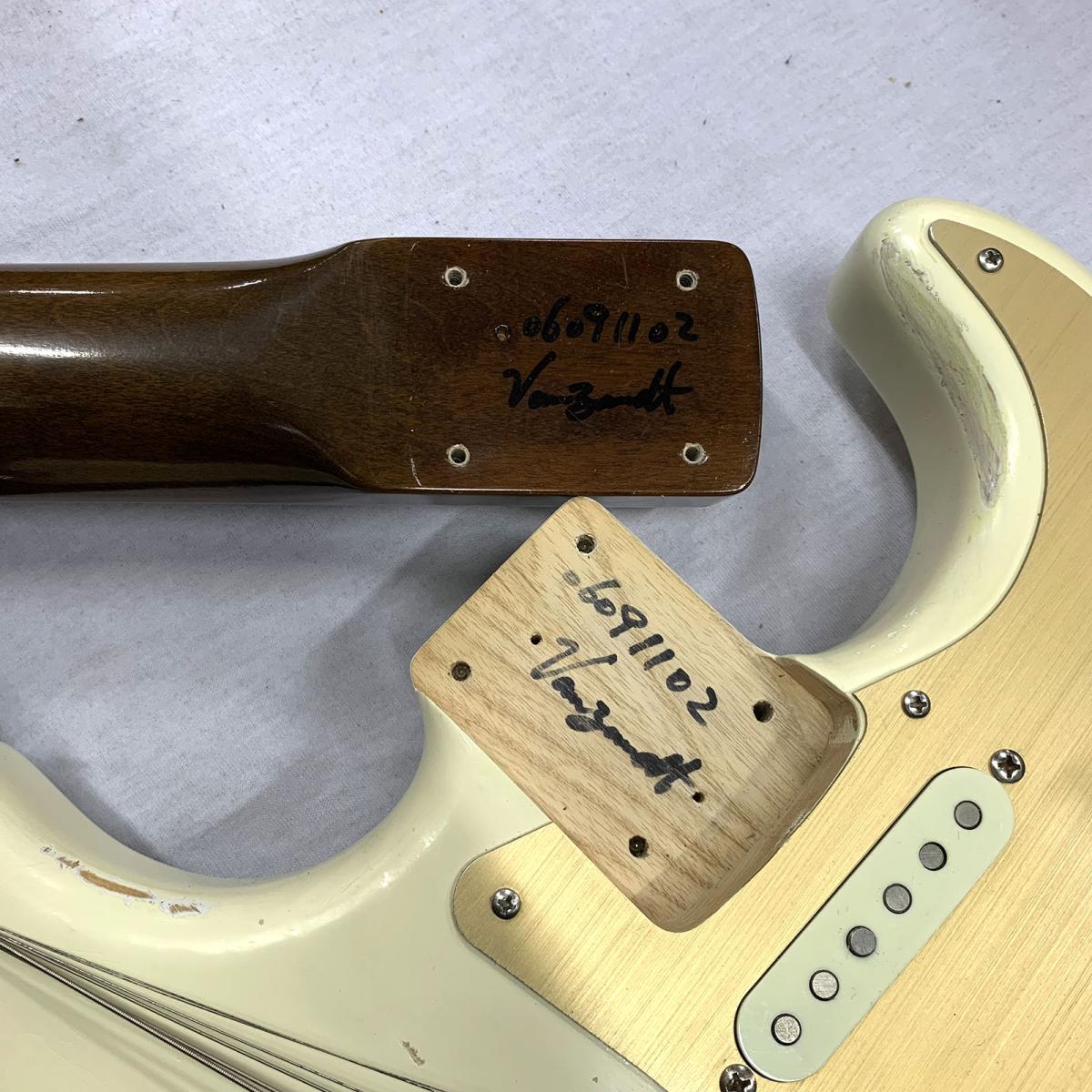 程よいレリック感のホワイトブロンドカラーにゴールドのピックガードが映えるルックス良しの1本。