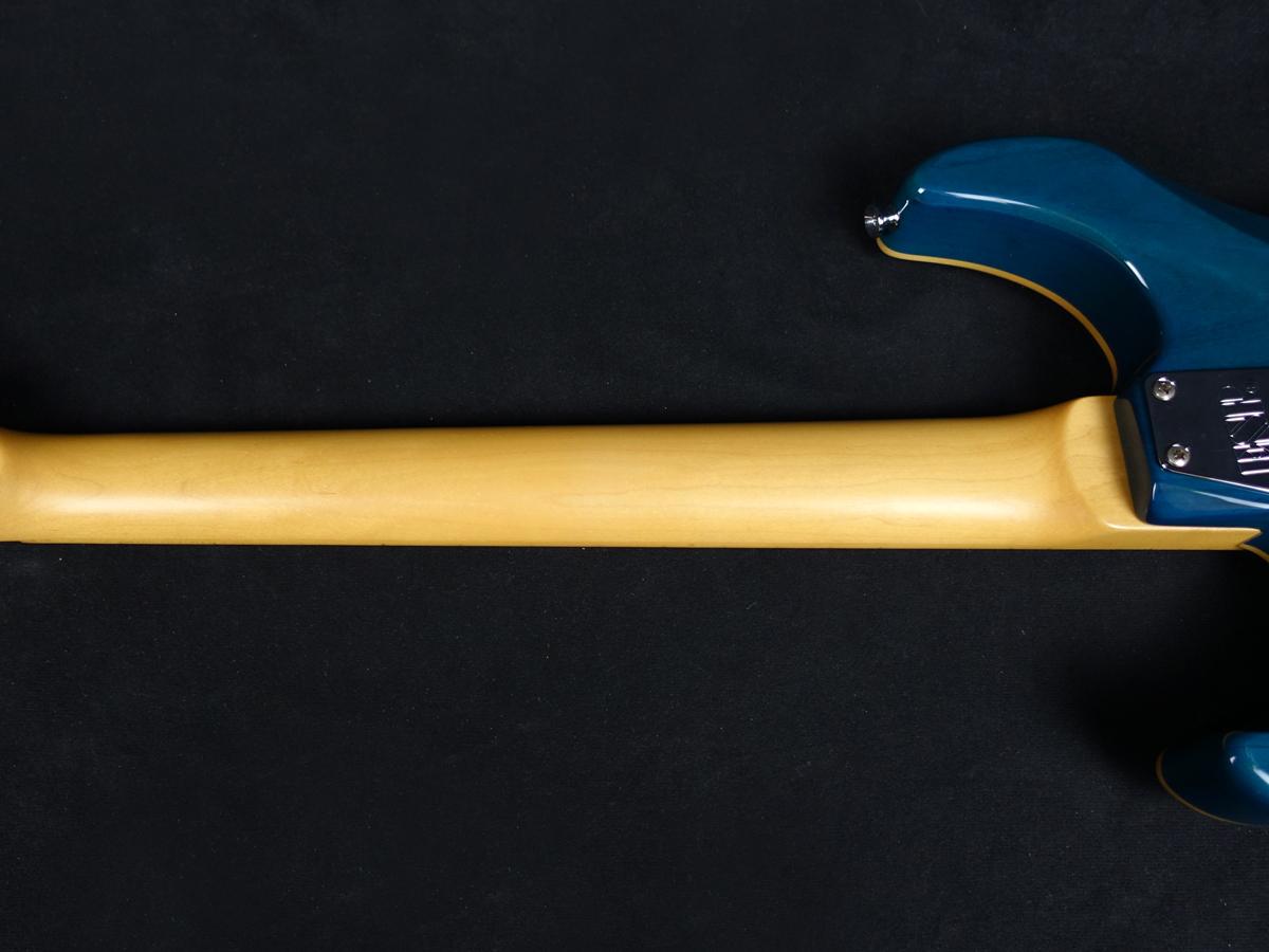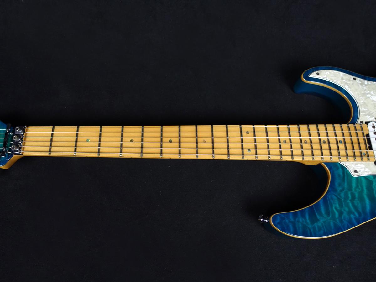 ナチュラルバインディングをあしらったボディはアルダーバックに美しい木目のキルトメイプルトップを採用。その他ウッドマテリアルはハードメイプルネックにメイプル指板を採用しております。