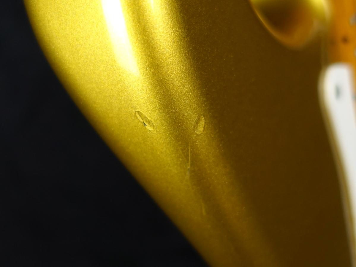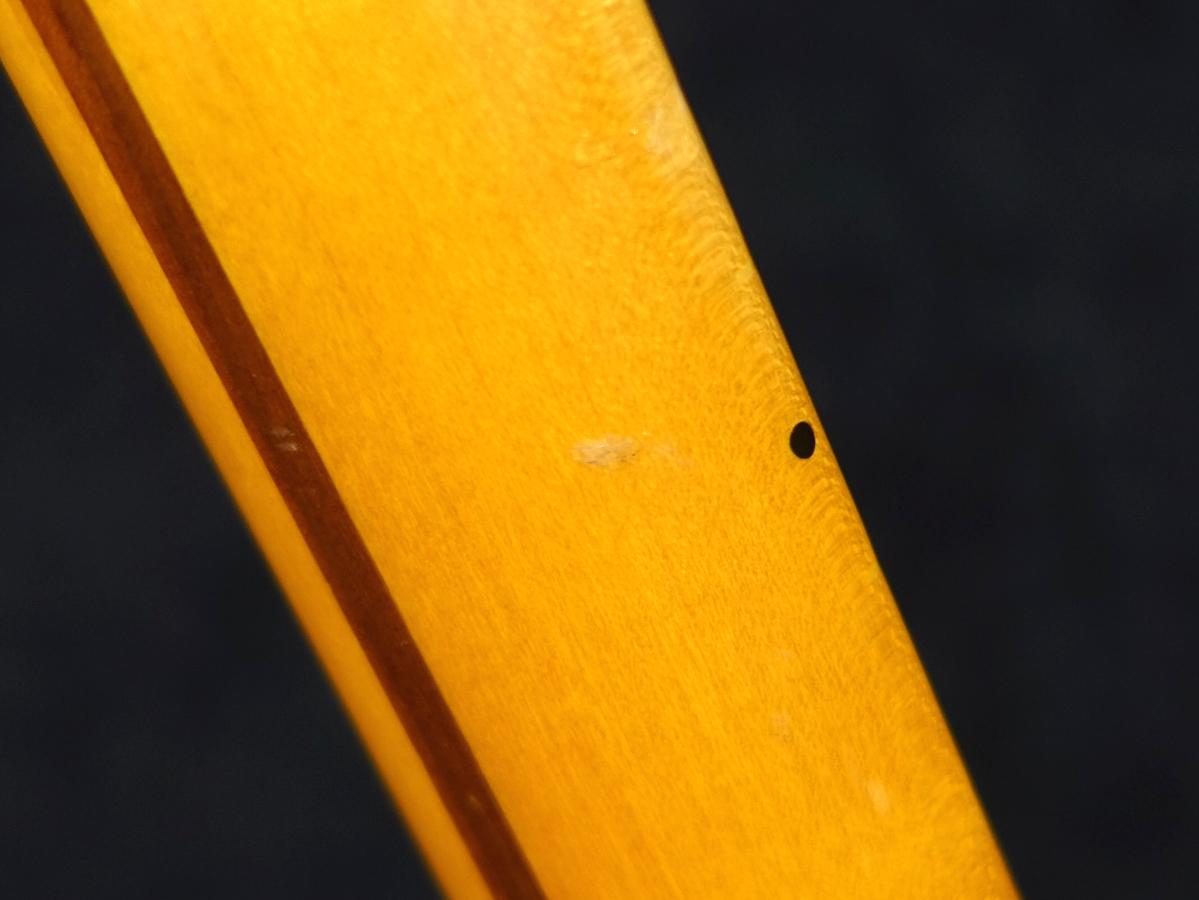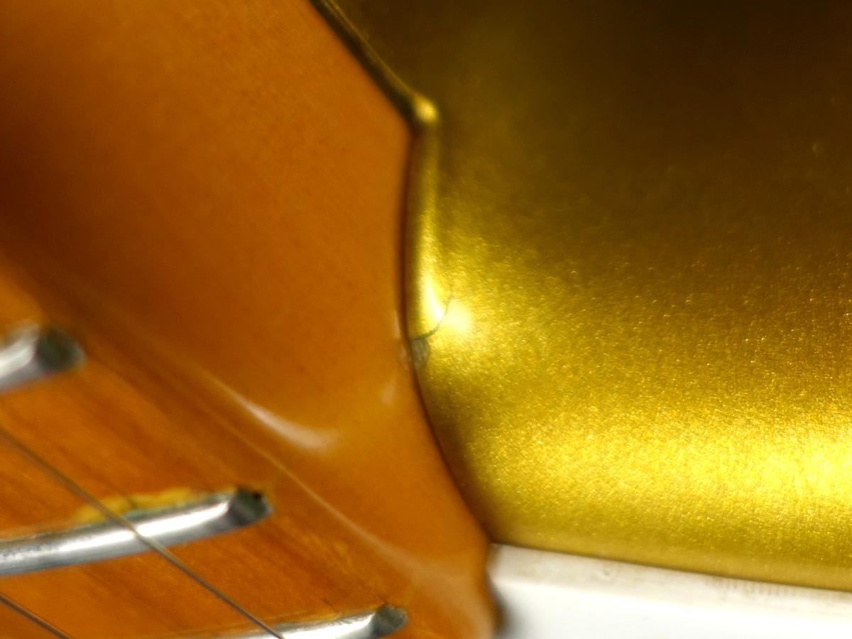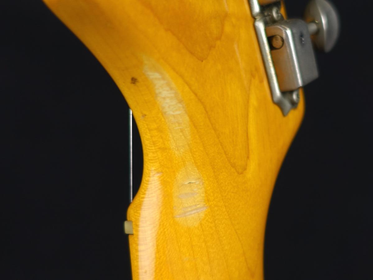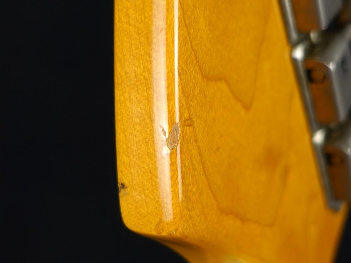 目立った箇所ではヘッド裏~ネック裏にかけてくびれている箇所に無数の打痕及び塗装剥がれ、ヘッドエッジ部や指板(ナット付近やフレット際等)に塗装欠け打痕等が見受けられる他、ネック全体に塗装のウェザーチェックも散見されます。