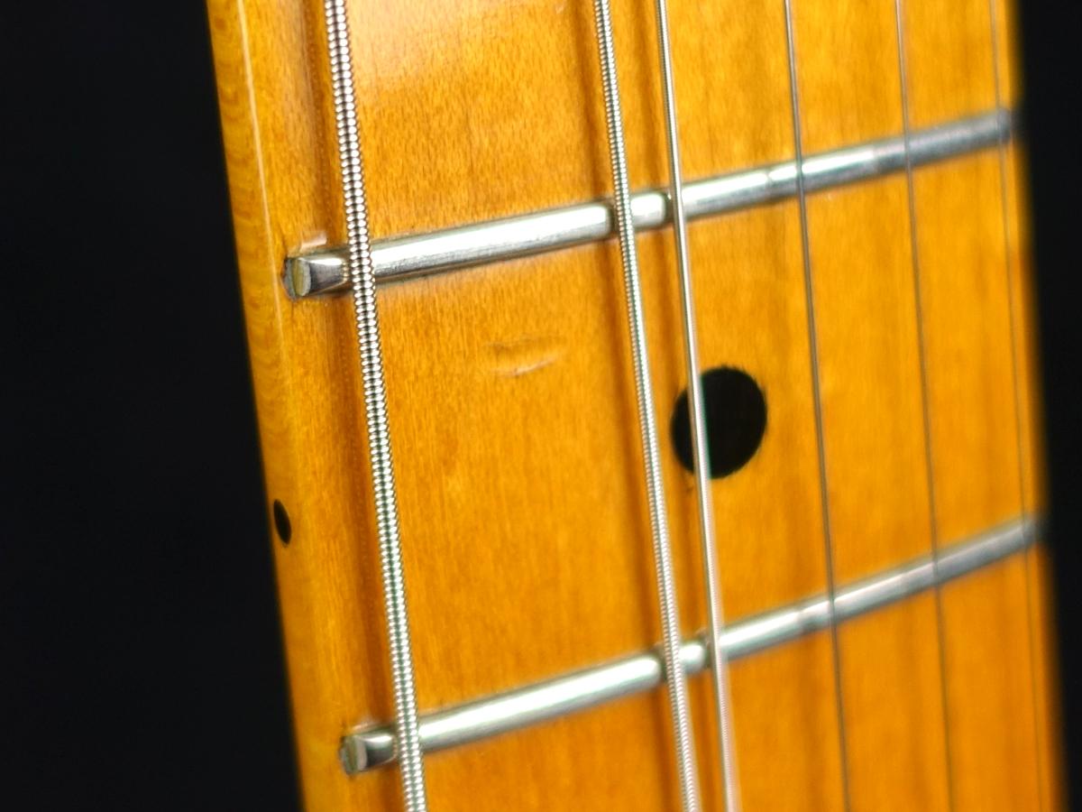 フレットはすり合わせが行われてるようで、残りは6割程度の高さになっておりますが、ヴィンテージサイズのフレットに馴染みが有る方であれば気にならない程度に高さは残している印象で、アンプを通した際に気になるようなビビリや音詰まりなどは感じられません。