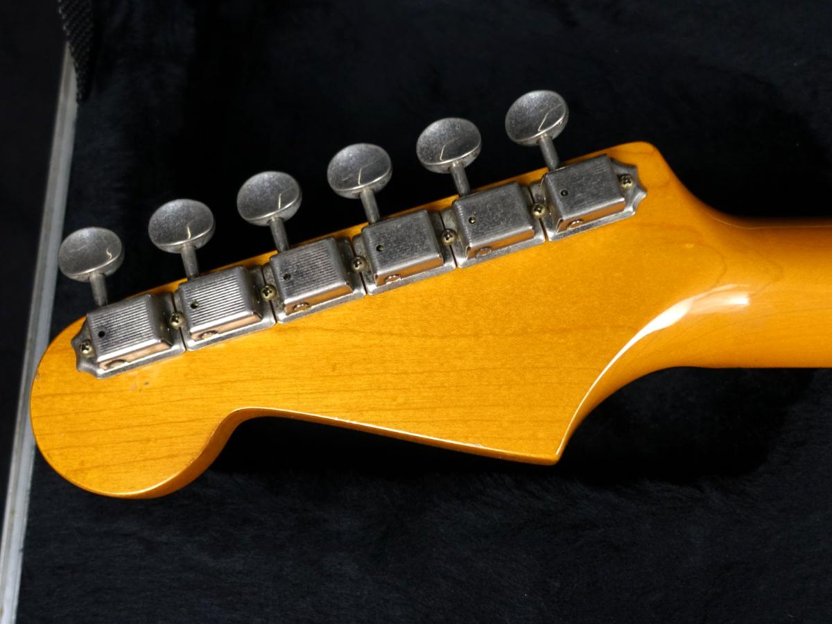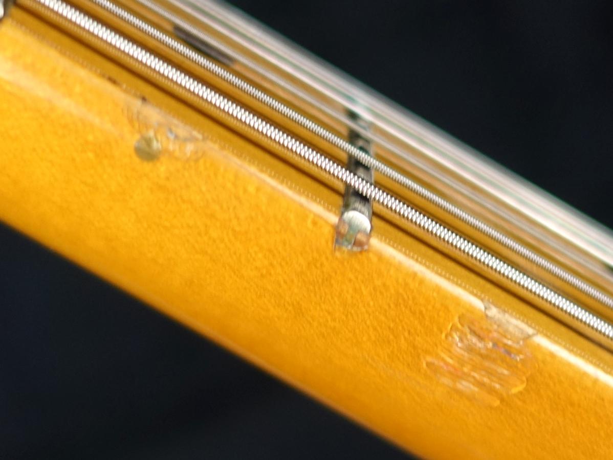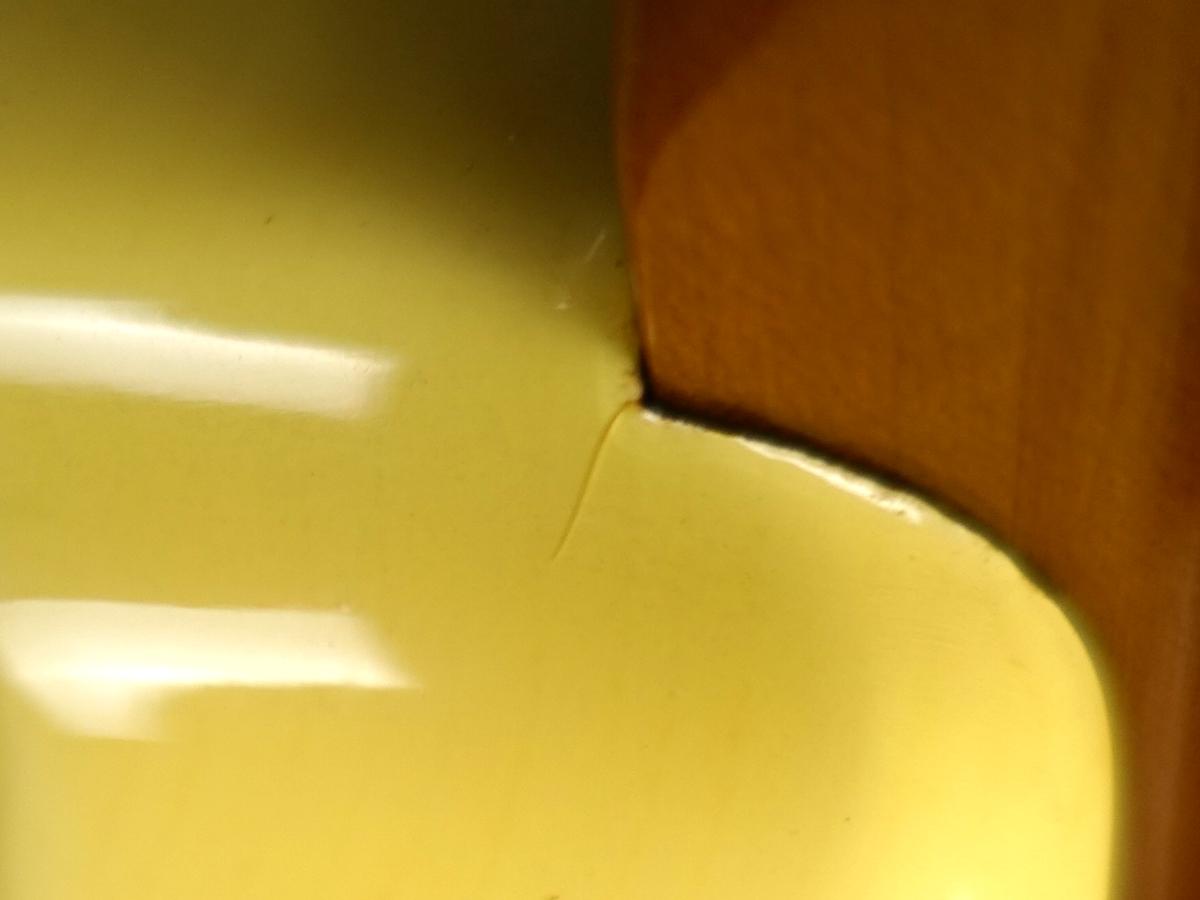 ありがちなネックジョイント部のボディ際に塗装のひび割れが見受けられる他、フロントピックアップ箇所のピックガード割れやノブのひび割れや小キズ、金属パーツのくすみ、パーツの汚れなど見受けられるなど、