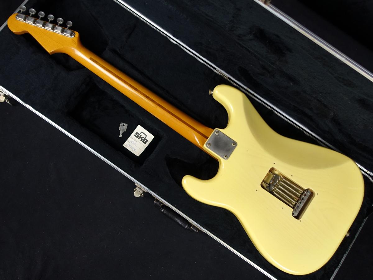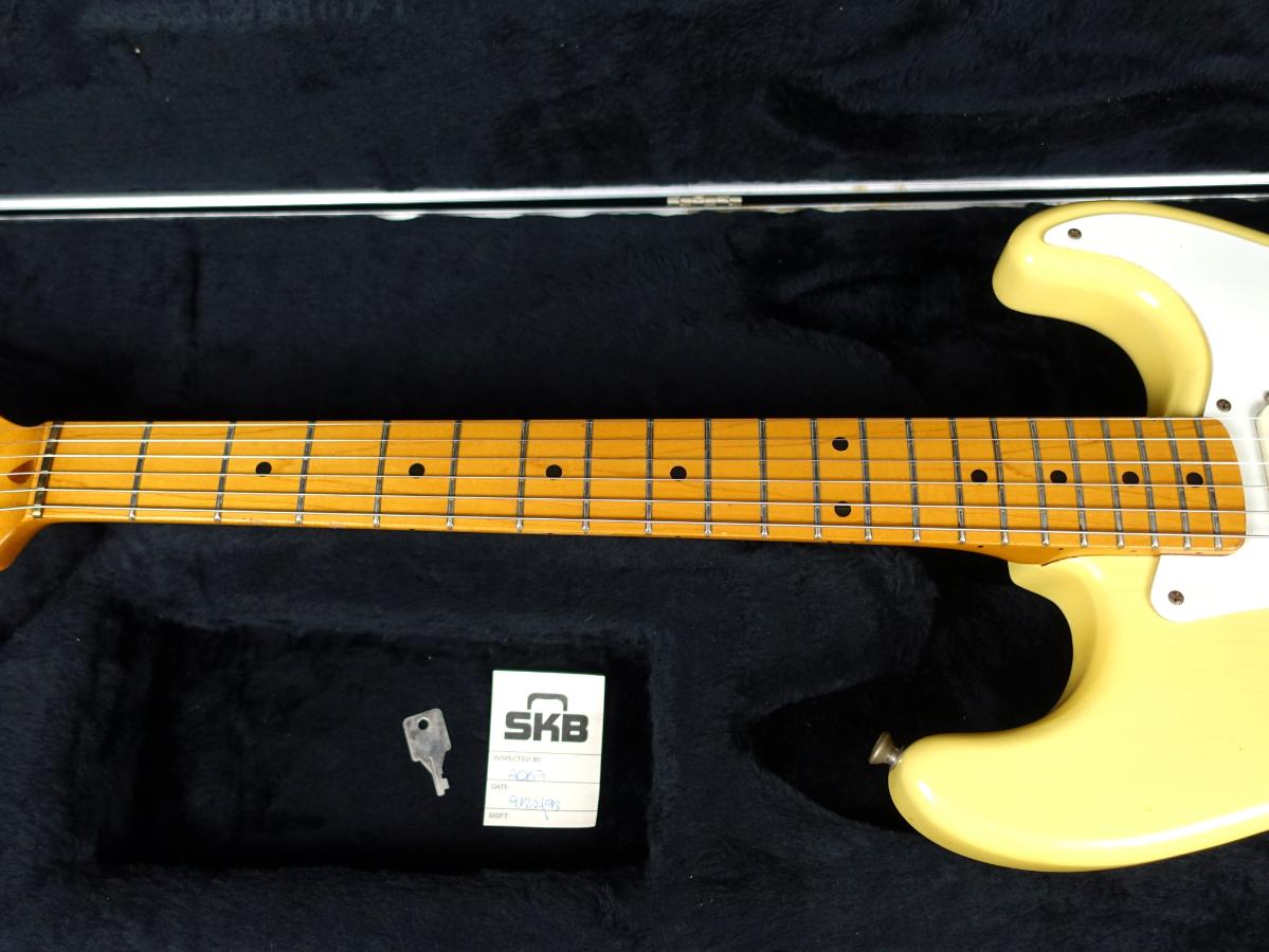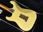 8点止めビスの1Pホワイトピックガードに、ノブやピックアップカバーなどもホワイトに統一され、ソフトVシェイプネック、ネック裏のスカンクストライプ、丸型のストリングガイドなど50年代初期を彷彿とさせるスタイル。