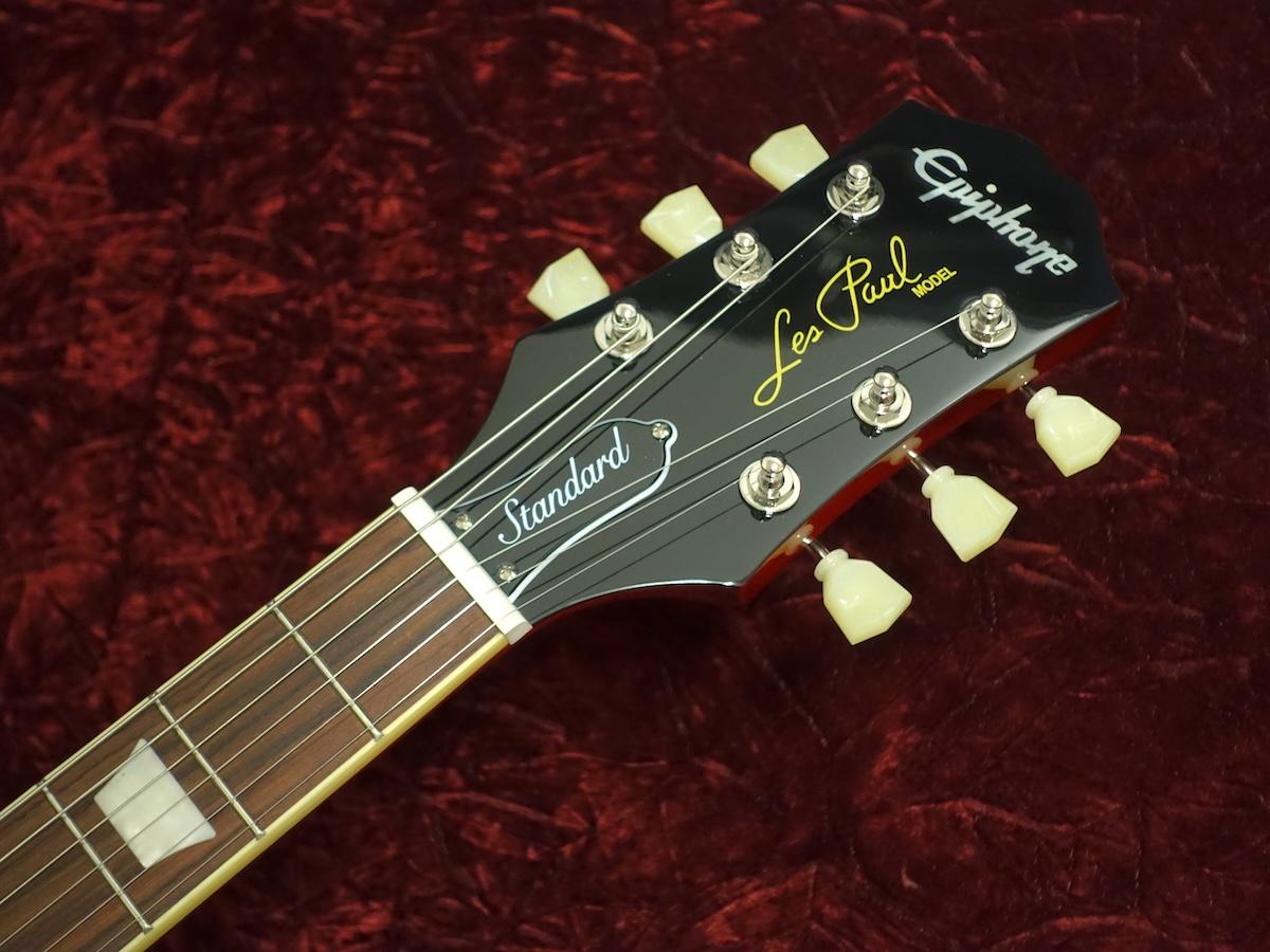 エピフォン・レスポール・スタンダード50sは、グロス仕上げのマホガニー・ボディにメイプルトップの材構成をもち、ロング・ネック・テノン仕様でジョイントされた50sシェイプ・マホガニー・ネック、クラシカルなディッシュ・インレイが施されたインディアン・ローレル指板、新開発のヴィンテージ・デラックス・チューナー、定評のあるエピフォンProBuckerハムバッカー、ダイヤル・ポインタ付きのゴールド・トップハット・ノブなど、充実の仕様群を誇ります。