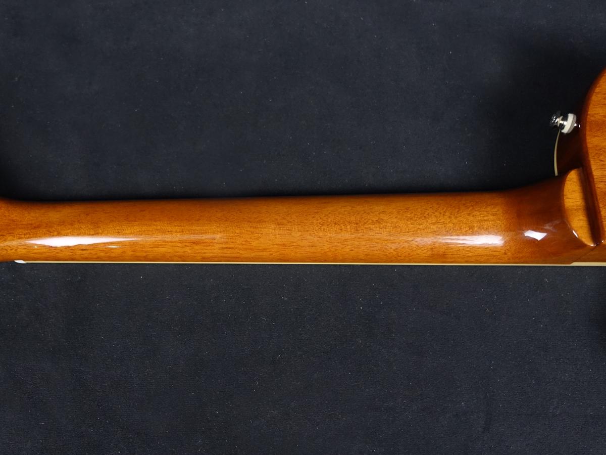 ロング・ネック・テノン仕様でジョイントされた50sシェイプ・マホガニー・ネック、クラシカルなディッシュ・インレイが施されたインディアン・ローレル指板。