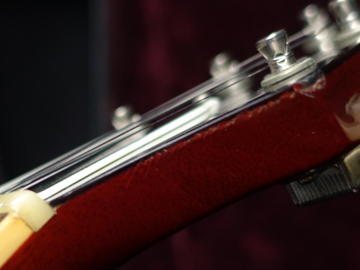 特に目立った箇所ではボディバックに3mm程度の打痕が広範囲に見受けられる他、ヘッドサイドと天板との間の塗装が割れ、剥がれが見受けれられます。