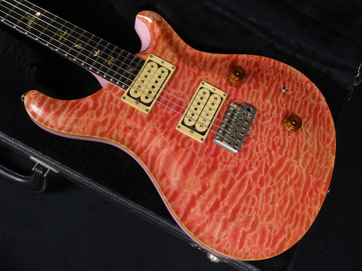 本機はトップはボニーピンクカラーにバック面にはミルクピンク、ボディトップは最高級グレードのキルトメイプル、指板は黒々としたブラジリアンローズウッド(ハカランダ)を採用しております。