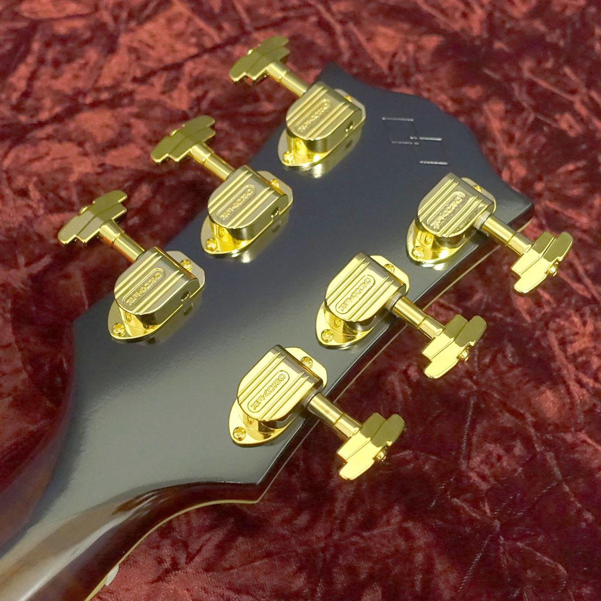 オープンブック型のヘッドストックには、エイジングの施されたマザー・オブ・パールを用いたヴィンテージ・スタイルのEpiphoneロゴとギブソン・クラウン・インレイが埋め込まれています。