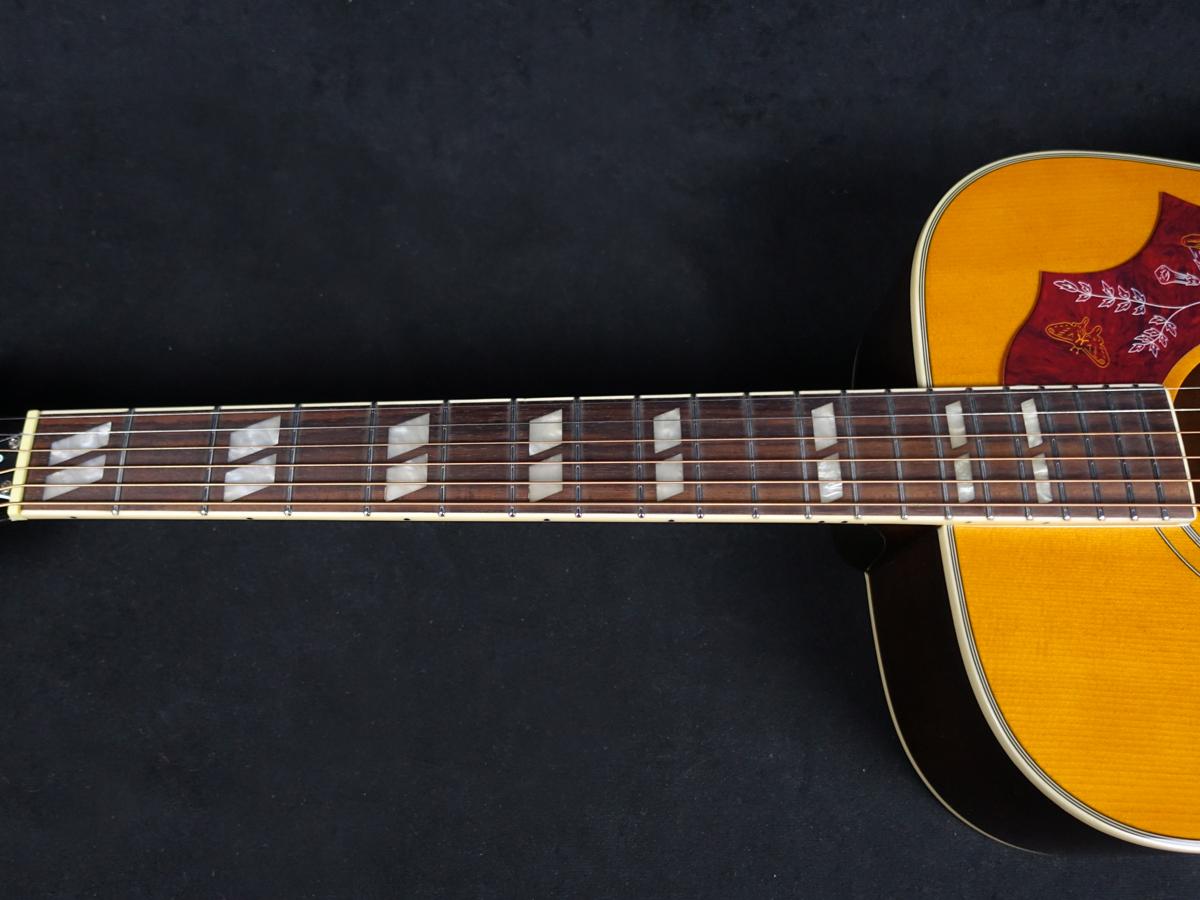バインディングが施されたローズウッド指板は20フレット仕様、Hummingbirdのデザインの特徴であるクラシックなスプリット・パラレログラム・インレイが装飾されています。