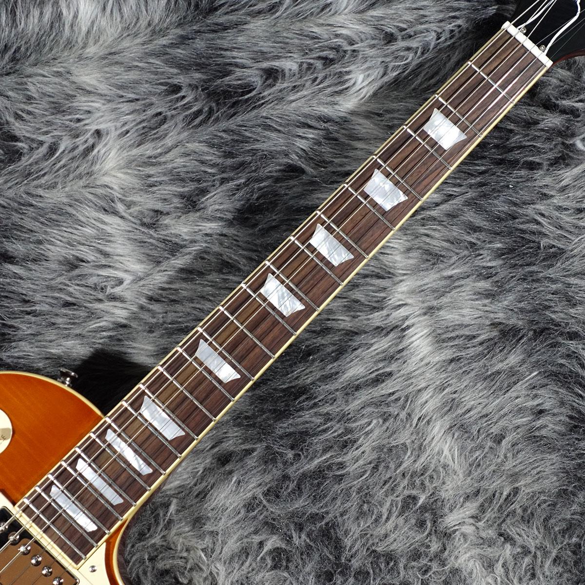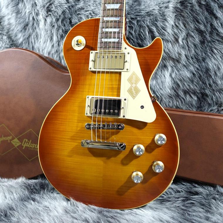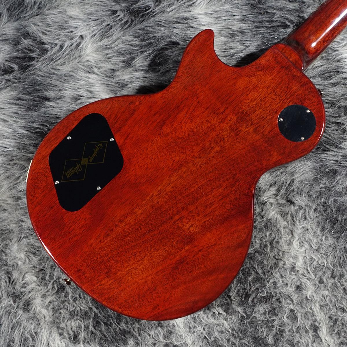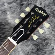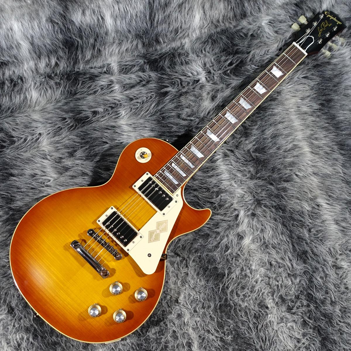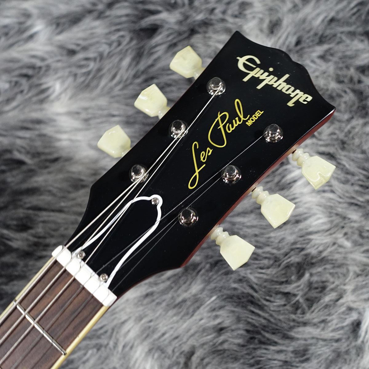 本モデルでは、ワンピース・マホガニー・ネック(ロング・ネック・テノン仕様)を採用し、豊かなサステインを実現。スリムテーパー・ネック・プロファイルにより、スムーズな演奏性を提供します。さらに、バインディングが施されたローズウッド指板、マザー・オブ・パールのトラペゾイド・インレイ、エイジド加工を施したEpiphoneロゴ、ゴールドでシルクスクリーン印刷された「Les Paul Model」の文字が入ったギブソン・スタイルの“オープンブック”ヘッドストックを採用。サイド・ドットの位置やサイズも、1960年当時のLes Paul Standardと同じ仕様になっています。ジェニューイン・マホガニー材のボディにメイプル・トップが貼られ、トップには美しいAAAフレイムメイプル化粧板があしらわれています。