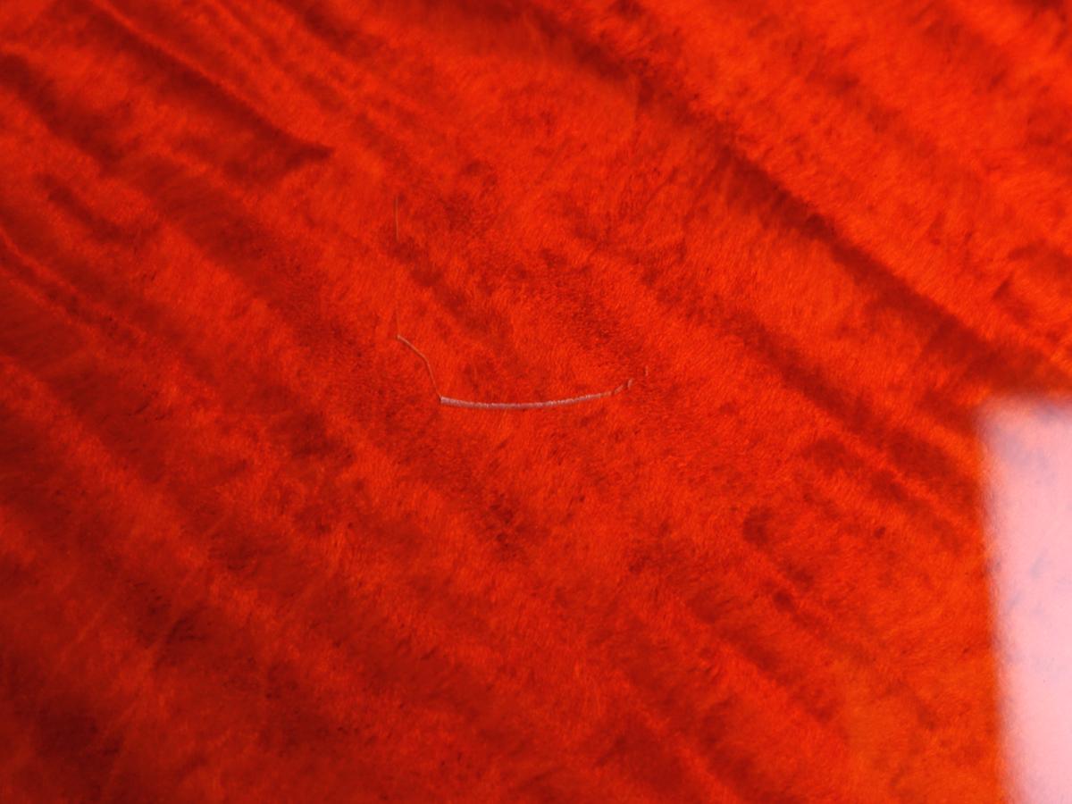 目立つ箇所でボディバック面に4cmほどのひっかき傷や、ブリッジのピンプラーによると思われるひっかき傷、サイドポジションマーク周辺の塗装の変色が見受けられる他、
