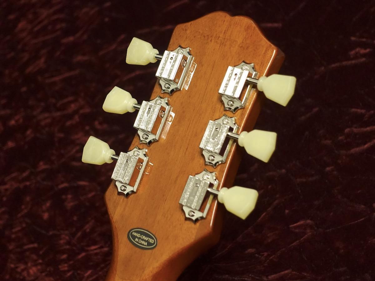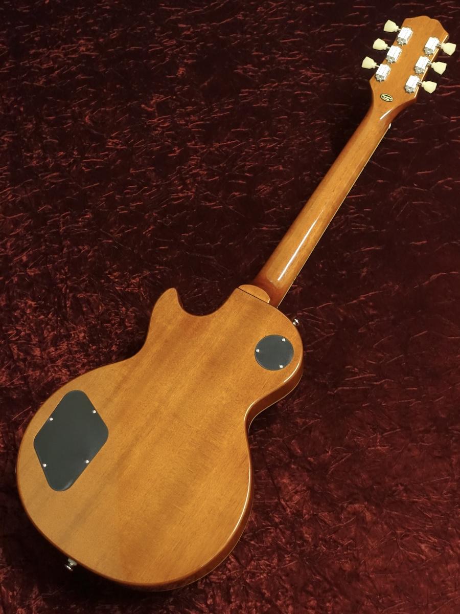 エピフォン・レスポール・スタンダード50sは、グロス仕上げのマホガニー・ボディにメイプルトップの材構成をもち、ロング・ネック・テノン仕様でジョイントされた50sシェイプ・マホガニー・ネック、クラシカルなディッシュ・インレイが施されたインディアン・ローレル指板、新開発のヴィンテージ・デラックス・チューナー、定評のあるエピフォンProBuckerハムバッカー、ダイヤル・ポインタ付きのゴールド・トップハット・ノブなど、充実の仕様群を誇ります。
