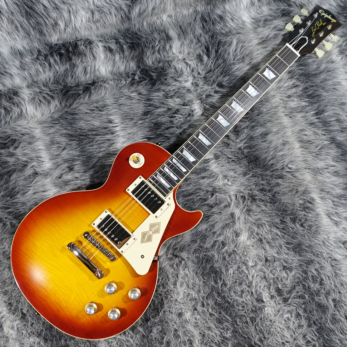 本モデルでは、ワンピース・マホガニー・ネック(ロング・ネック・テノン仕様)を採用し、豊かなサステインを実現。スリムテーパー・ネック・プロファイルにより、スムーズな演奏性を提供します。さらに、バインディングが施されたローズウッド指板、マザー・オブ・パールのトラペゾイド・インレイ、エイジド加工を施したEpiphoneロゴ、ゴールドでシルクスクリーン印刷された「Les Paul Model」の文字が入ったギブソン・スタイルの“オープンブック”ヘッドストックを採用。サイド・ドットの位置やサイズも、1960年当時のLes Paul Standardと同じ仕様になっています。ジェニューイン・マホガニー材のボディにメイプル・トップが貼られ、トップには美しいAAAフレイムメイプル化粧板があしらわれています。