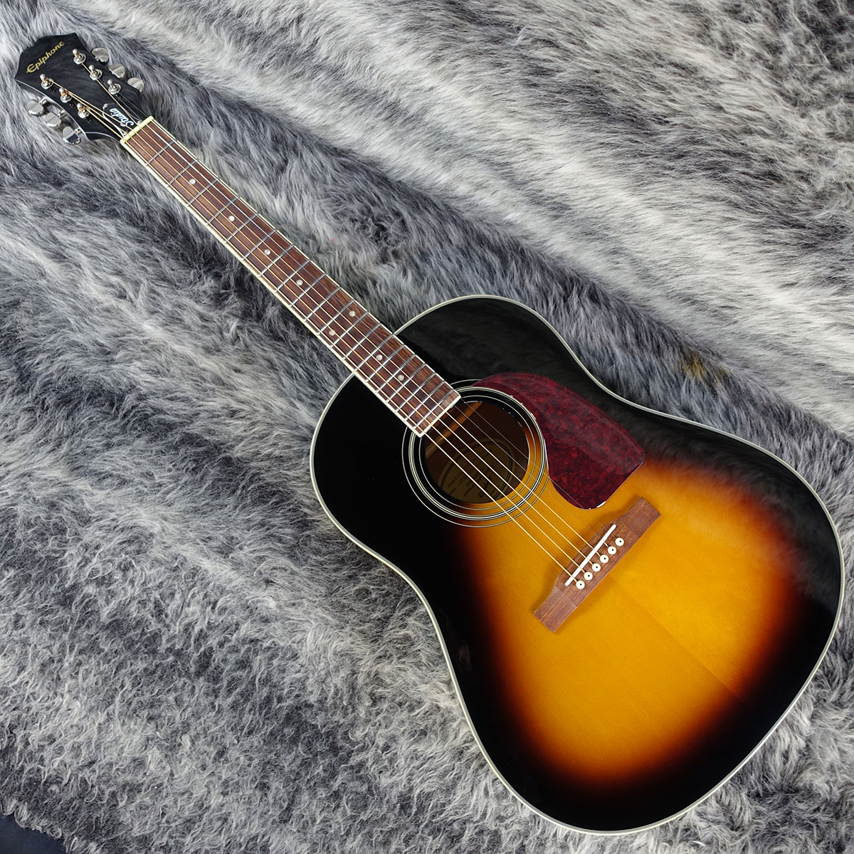 ティアドロップ形でダークなトータスシェル柄のピックガード、アイボリー色のプラスチックボタンを備えた3連チューナー、そして金色のシルクスクリーンによるエピフォン・ロゴと60年代カラマズースタイルのヘッドストック等、ギブソンファン垂涎の仕様内容を誇ります。