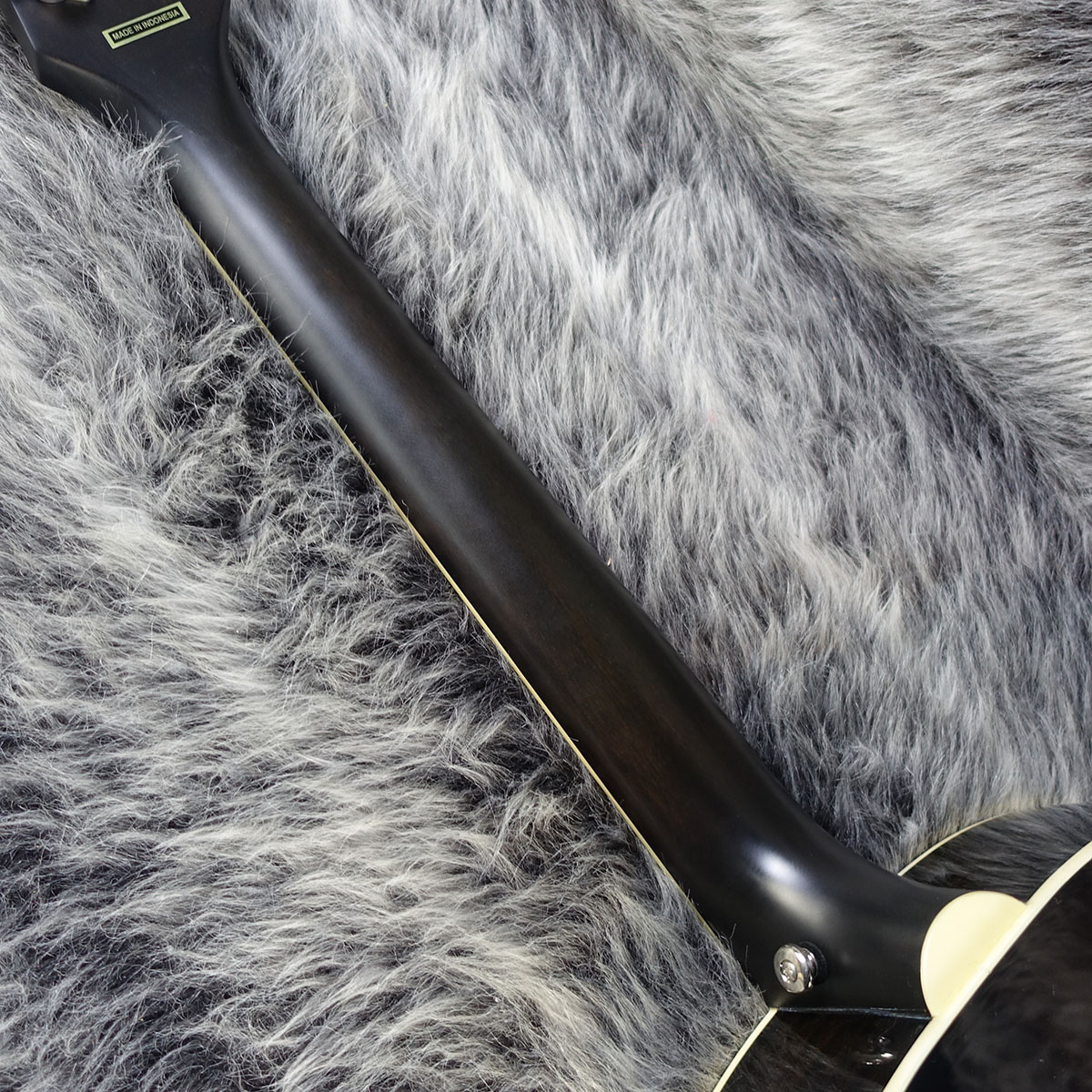 ローズウッド指板には20本のフレットが打たれ、シンプルなパーロイド製のドット・インレイが施されています。