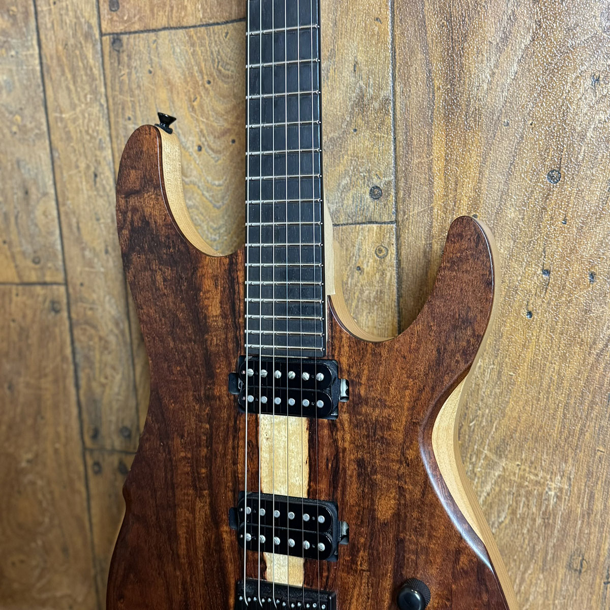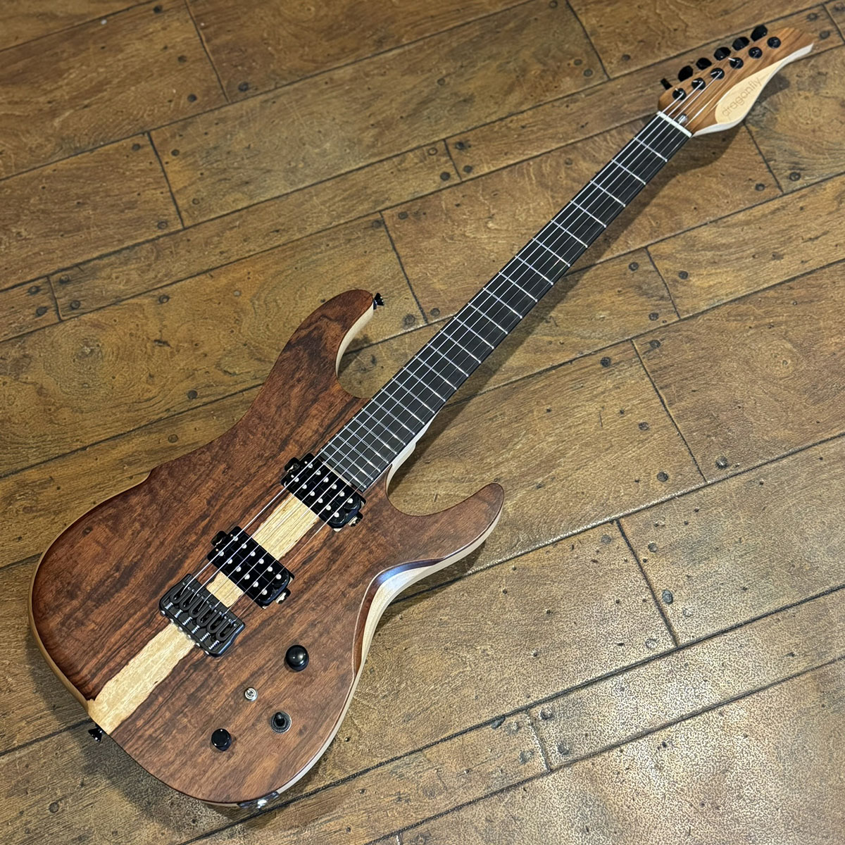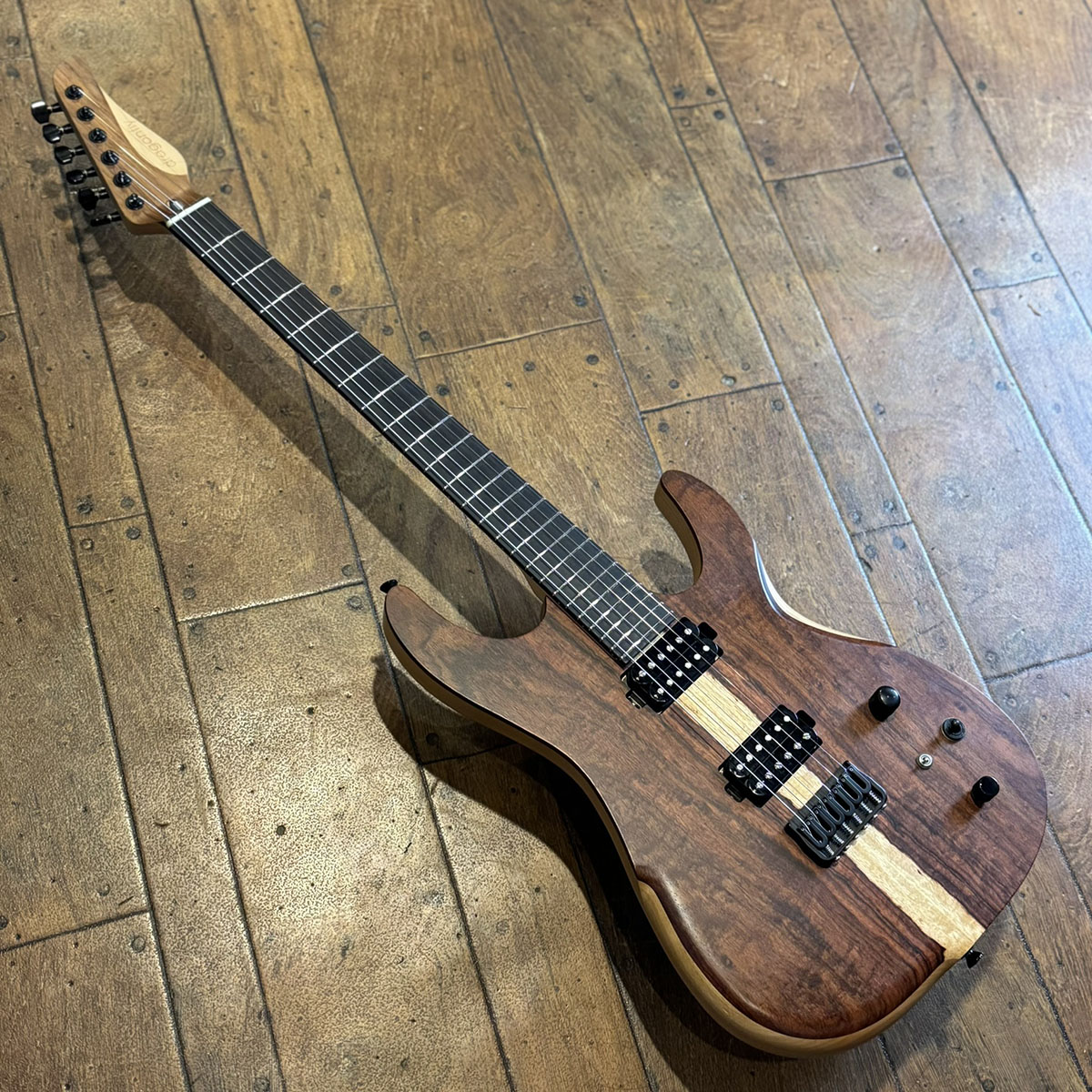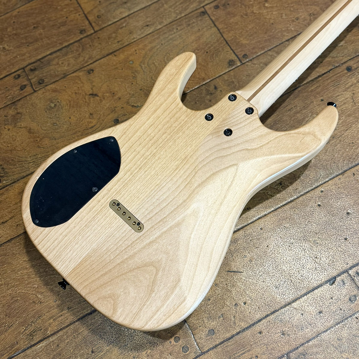 スペックシートがないためマテリアルは目視での確認となりますが、ボディトップにはサップの入った高級感のあるウォルナット、バック材はアルダーが採用されています。