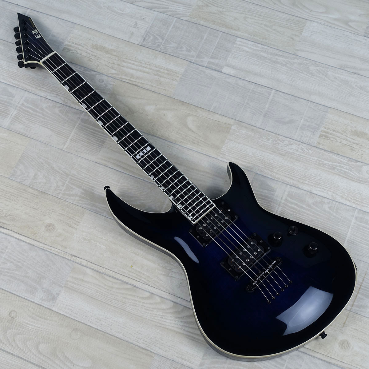 フレイムメイプルトップにアルダーバックのボディ、3ピースメイプルのスルーネック、エボニー指板というマテリアル。