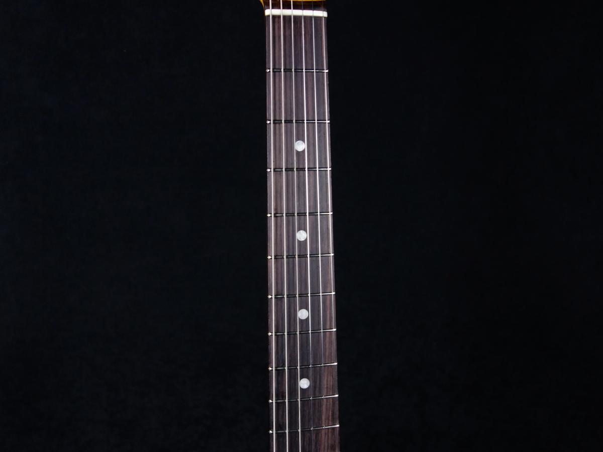 1965 Stratocasterは、1965 “C”シェイプメイプルネックに、大きめのパールドットインレイを採用したラウンドラミネイトローズウッド指板を備えているのが最大の特徴です。
