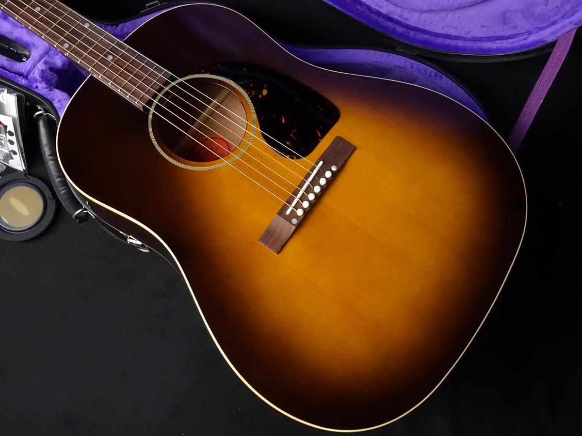 トップとバックにシングルプライ・バインディングが施されたボディは、グロス・フィニッシュの光沢を若干抑えた “ニューヴィンテージ・グロス“ 仕上げを採用。 僅かに退色したカラーを再現した“ウォッシュド・ヴィンテージ・サンバースト“との組み合わせにより、 ヴィンテージの質感溢れるルックスになっています。ピックガードは、べっ甲色のクラシックなティアドロップ・シェイプで、J-45のルックスを引きたてます。さらに、サウンドホール周りのパーフリングは奥田民生氏愛用のJ-45と同じ7層になっており、細部にわたりギブソンのオリジナルに近づけた拘り抜いた出来栄えとなっています。
