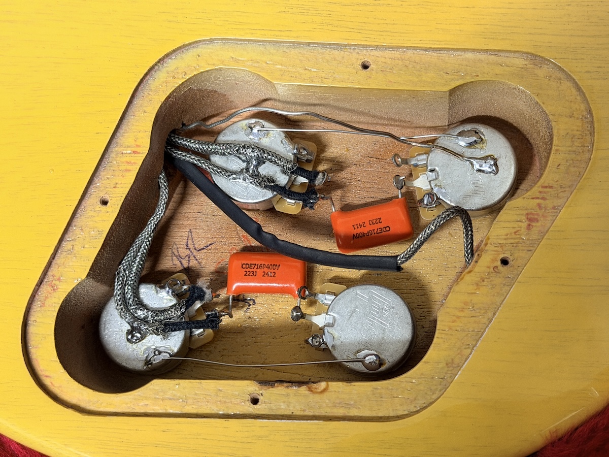 ペグがクルーソンのホワイトボタンペグへ交換されており、ブッシュはコンバージョンブッシュへ変更されております。ヴィンテージライクなルックスになっており、好みの方も多いのではないでしょうか。