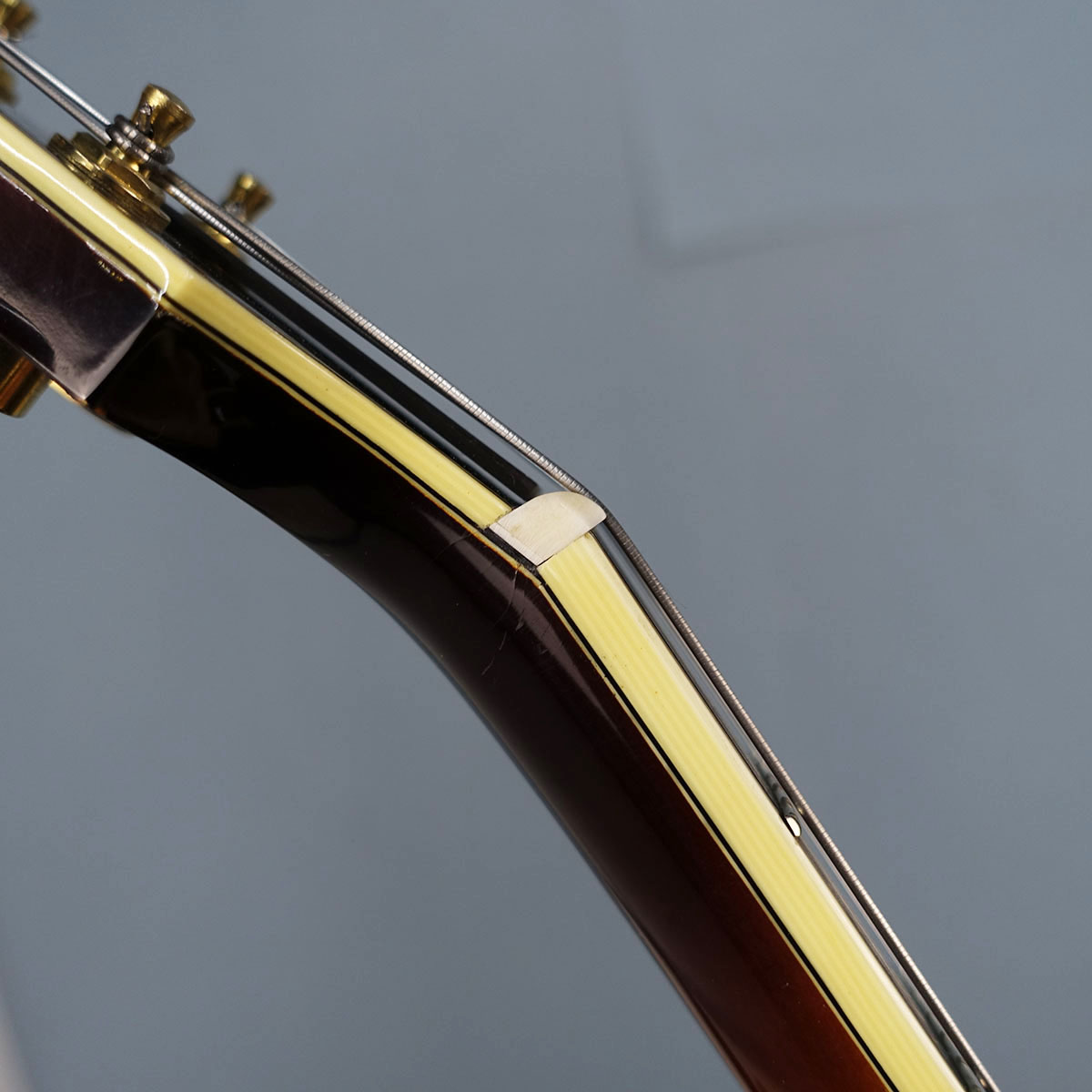 フレットの消耗はあまり見られませんが、ナットの交換がされています。材質は牛骨、底面に上げ底される形で牛骨が貼られていますが恐らく交換時から貼られて作成されているようです。
