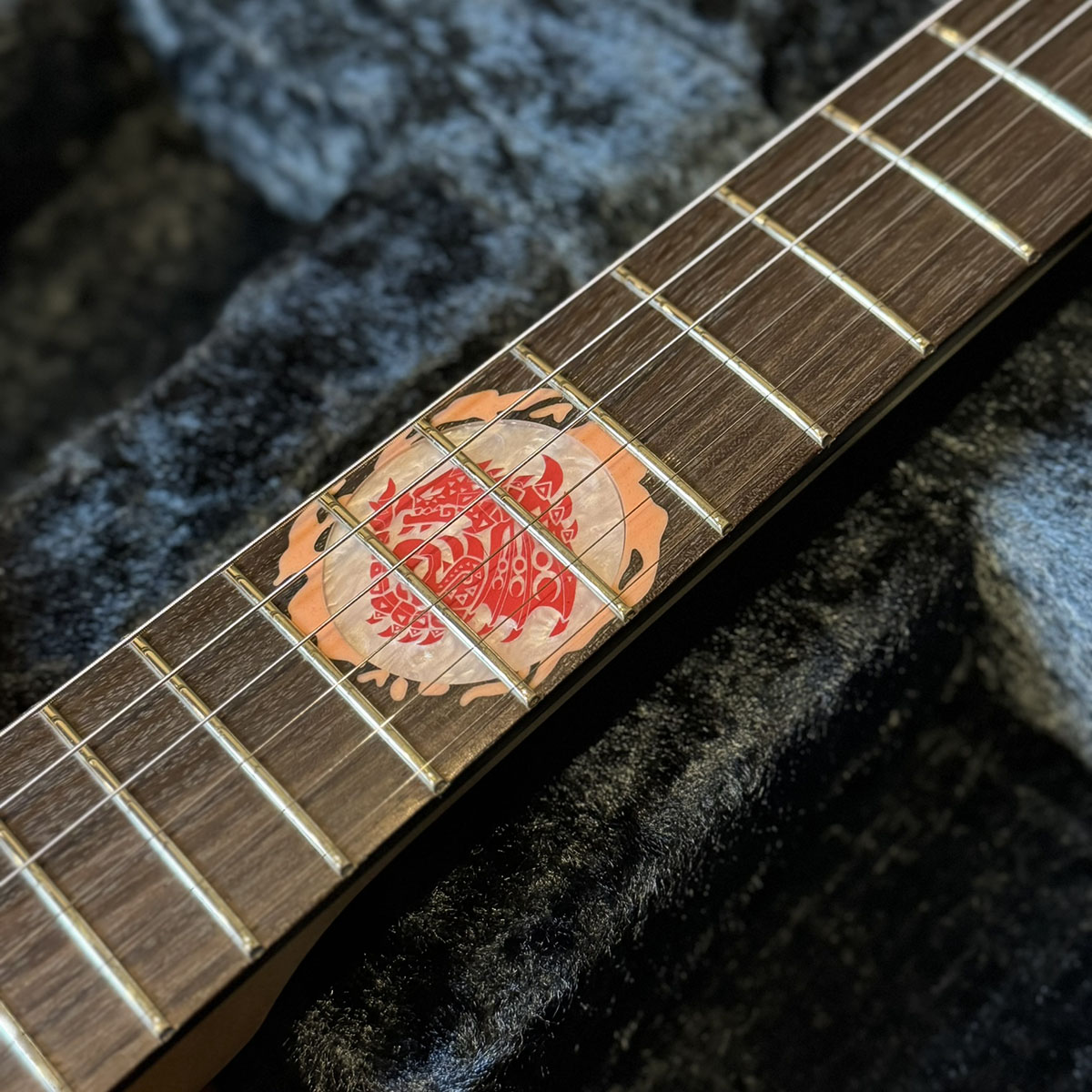 リオレウスを表現したオリジナルのカラーリングやピックガードの素材、全てブラックで統一したハードウェアなどにも拘った、唯一無二のギターです。