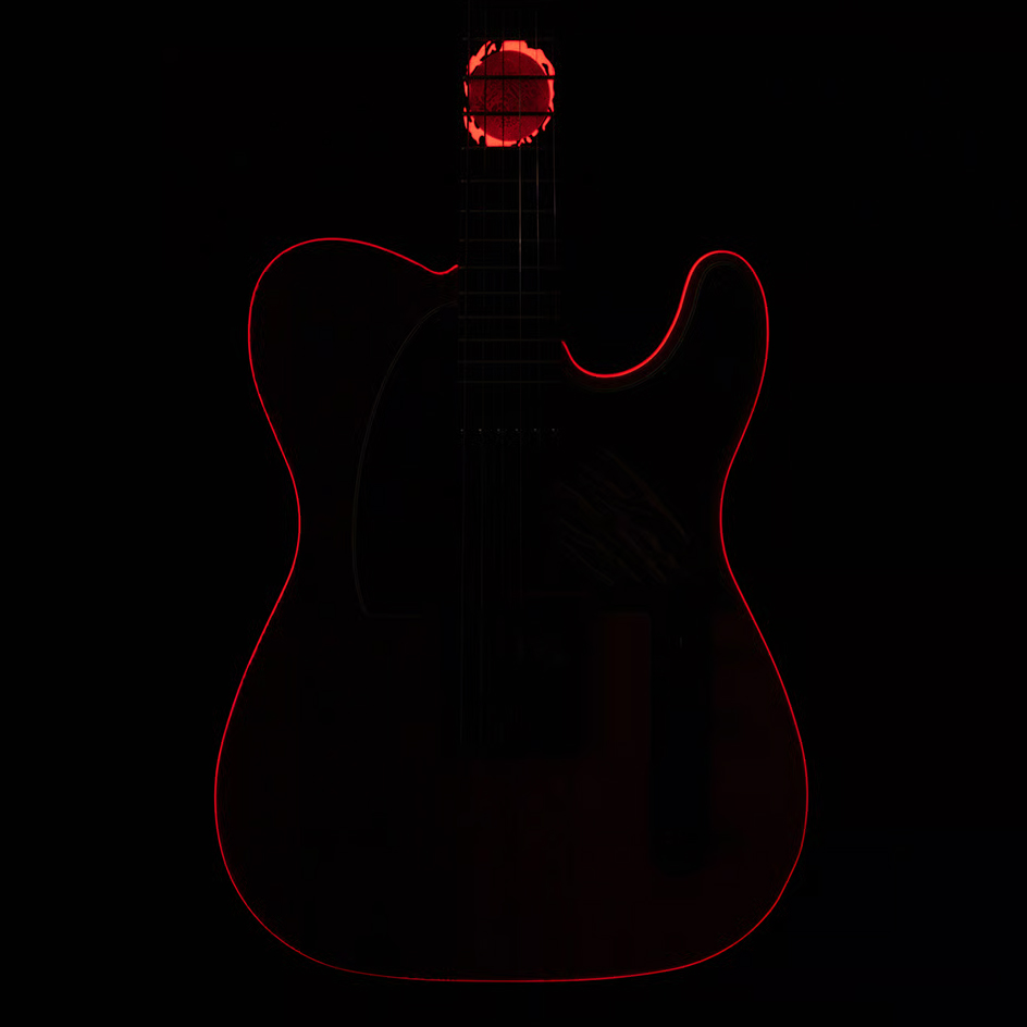 さらに、ボディバインディングと12フレットのインレイ、サイドドットには、蓄光素材を採用しており暗闇の中で赤く光ります。