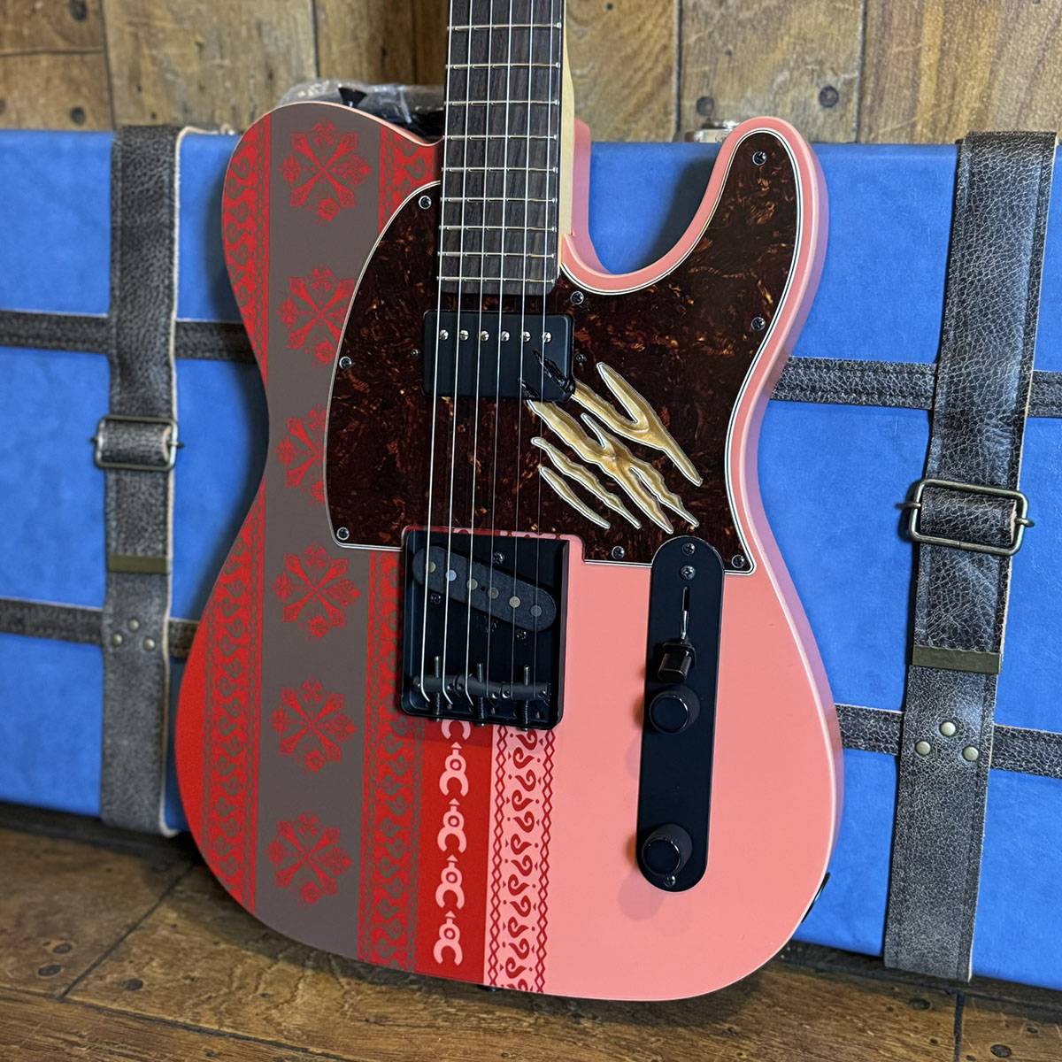 Fender Flagship Tokyoおよびフェンダーオンラインショップで限定販売された本機『Limited Monster Hunter Rathalos Telecaster』は、ピックアップカバーとピックガードを貫通するリオレウスの爪痕が表現されているほか、ネックの裏側にもリオレウスの羽の模様が刻印されています。