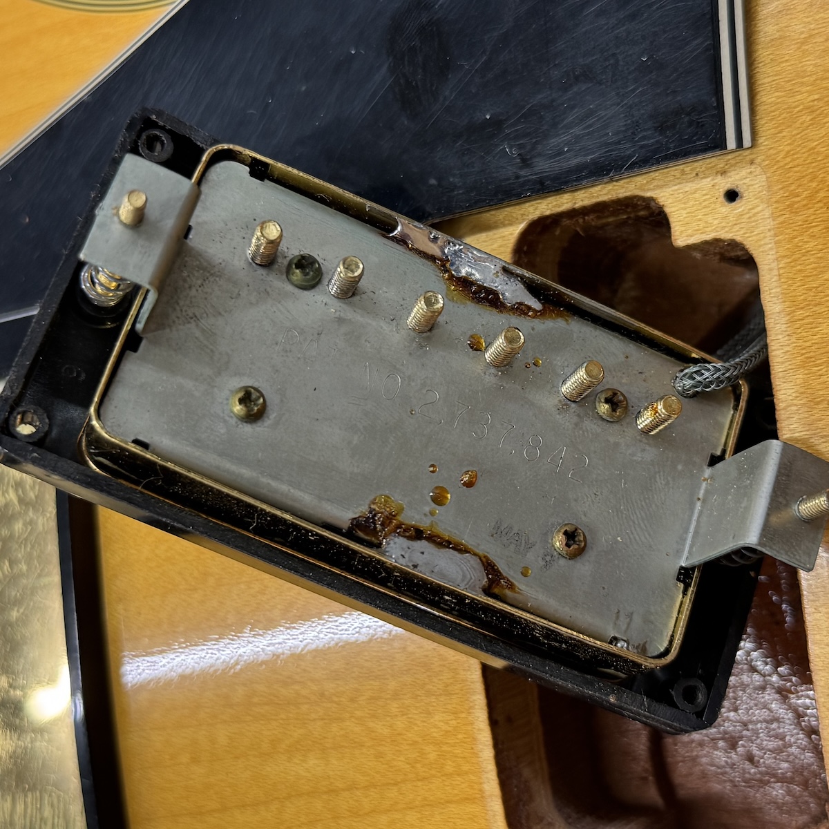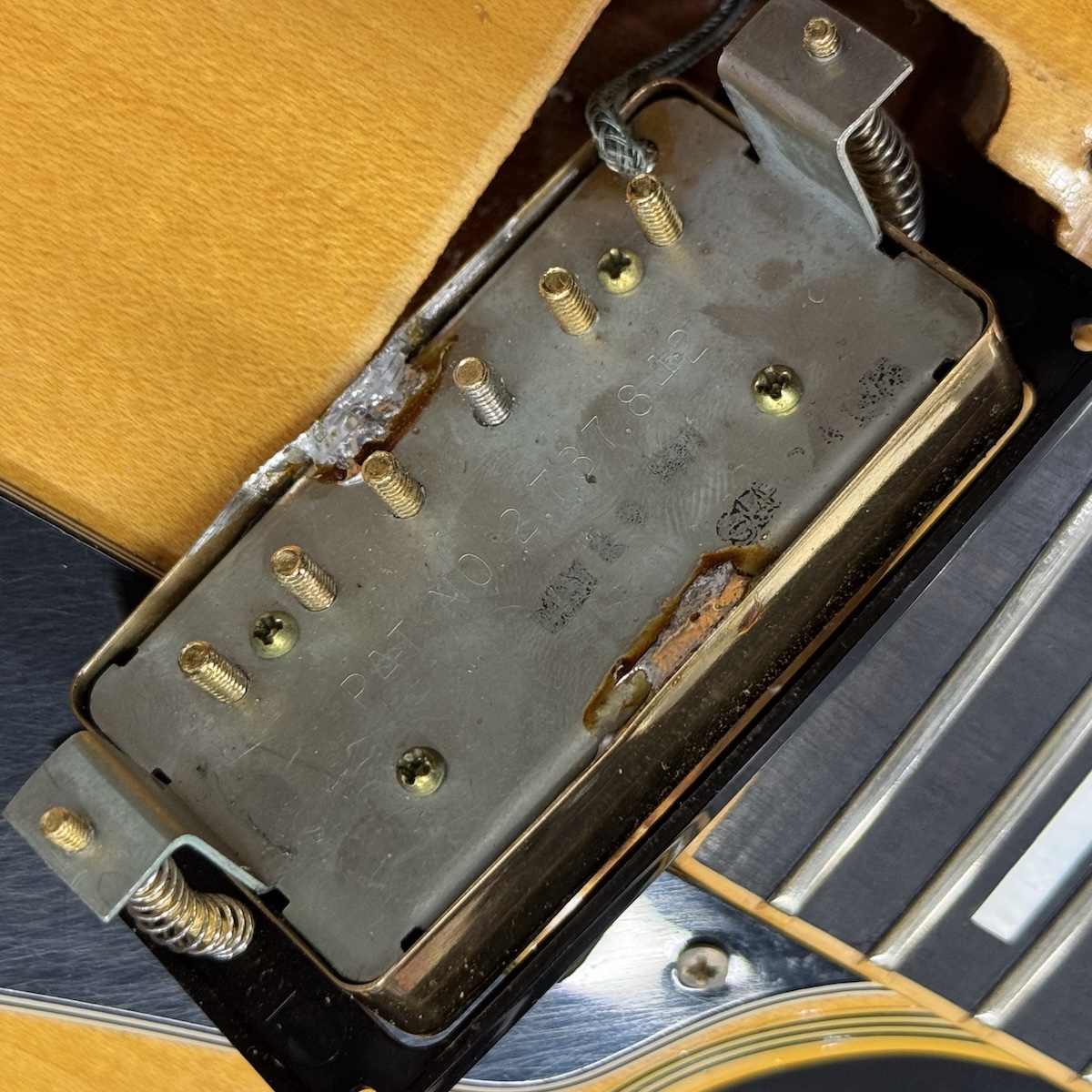 マテリアルは3Pメイプルトップ、1Pマホガニーバック、3Pメイプルネック、エボニー指板。エンドピンが交換されておりますが、その他のパーツは全てオリジナル。ポットデイトは1976年です。本体重量は約4.94kgと70年代らしいウエイトで、密度の高い低域と伸びやかなサスティーンに加え、骨太なロックサウンドを楽しめます。