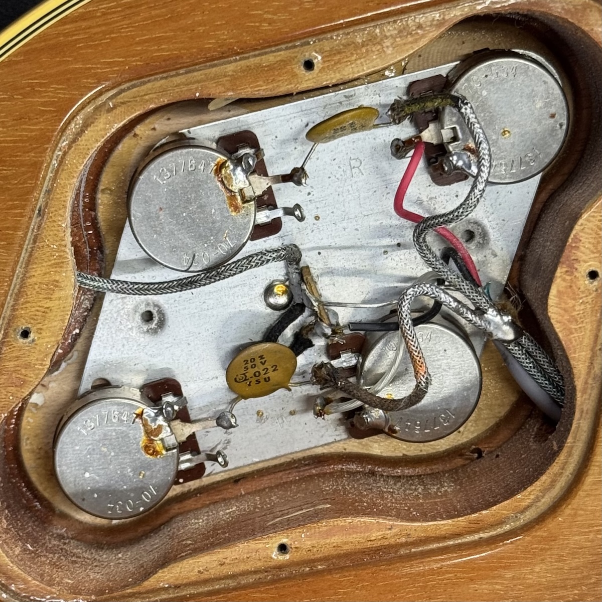 外観は打痕や擦り傷、ジャックプレートの割れなどあるものの、製造から半世紀余り経過した個体としてはかなり綺麗な外観です。ネックコンディションは概ね良好、トラスロッドはやや締める方へ硬めですが、まだまだ余裕がございます。