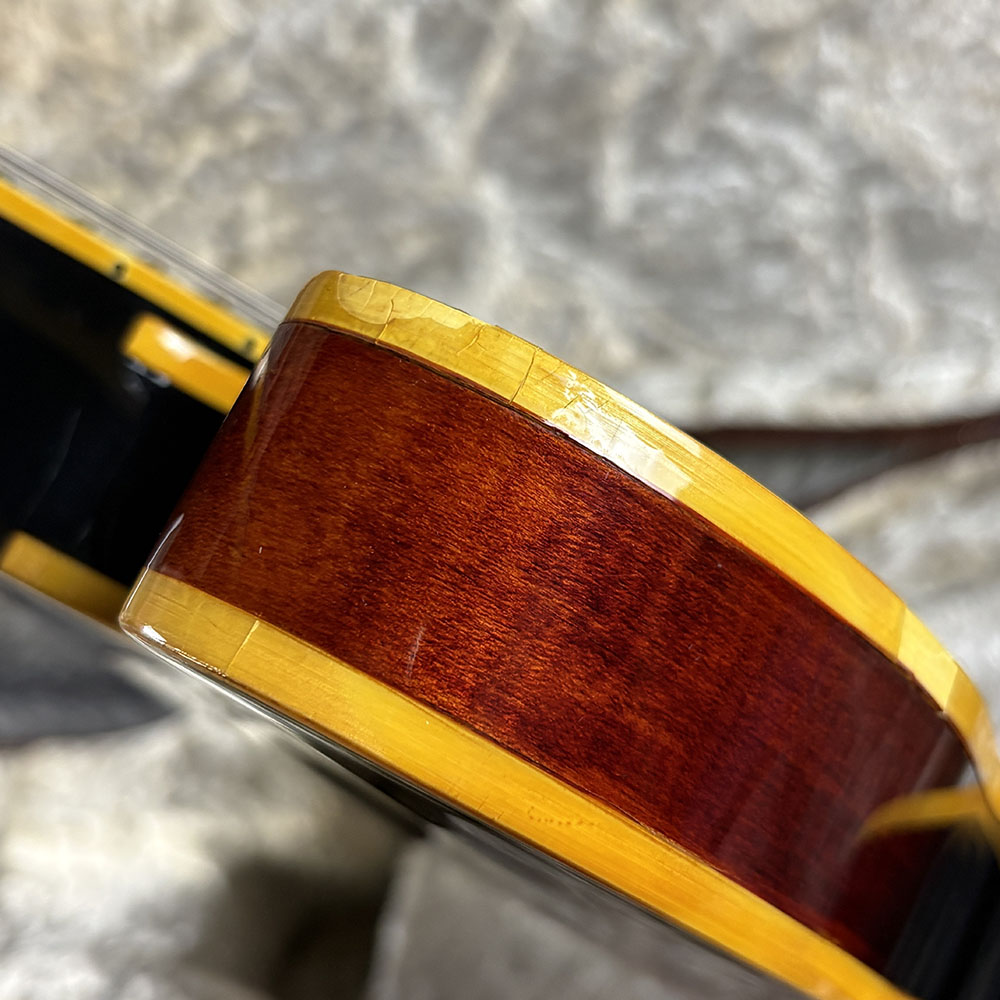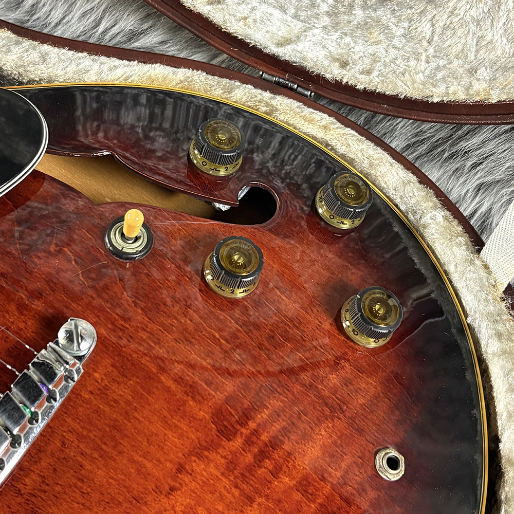 フレイムメイプルボディ、ブラジリアンローズウッド指板、マホガニー/メイプル/マホガニーの3Pネックを採用したウッドマテリアル。