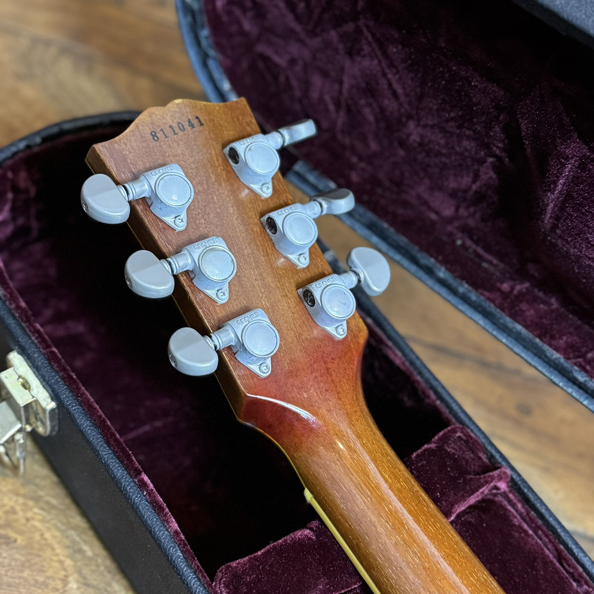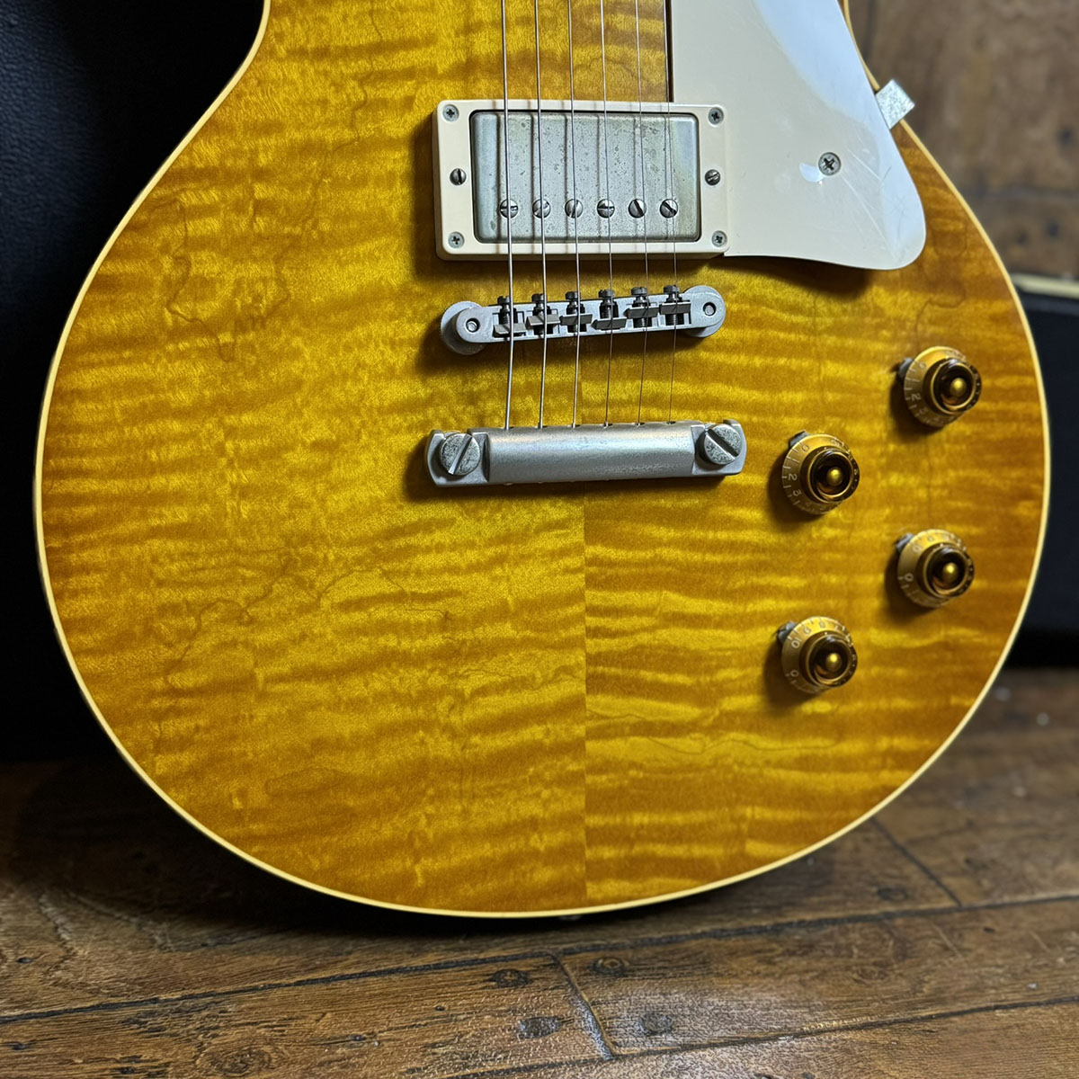 1958レスポールながら目を見張るほどの素晴らしいフィギュアドトップを備え、デフォルトでGrover Tunerを搭載した嬉しいスペックの1本です。