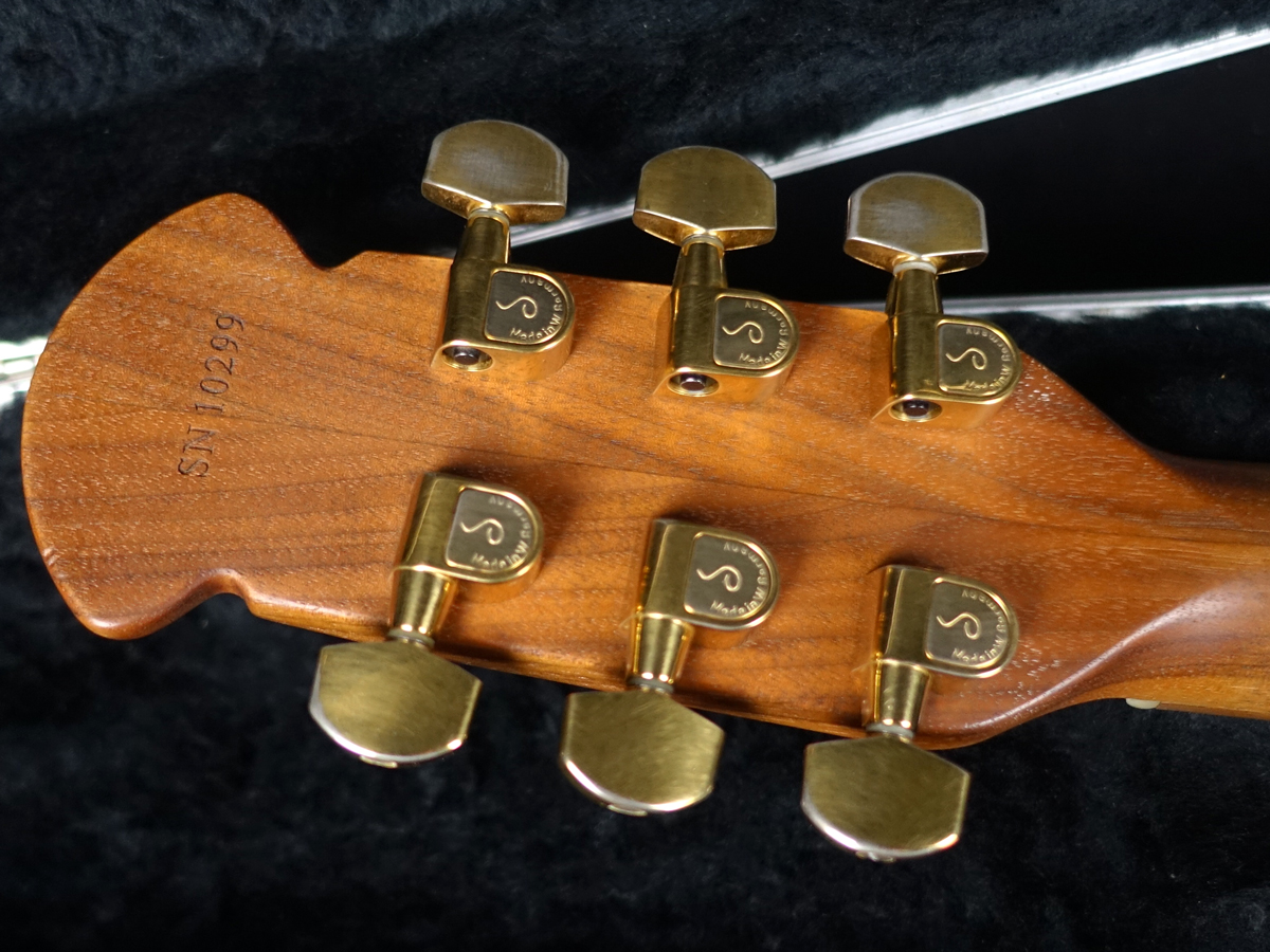 ゴールドウェアのペグ、ウォルナット材を用いたブリッジ&ヘッドストックの装飾が上位機種らしい品格を醸しだしており、この彫刻にときめいてしまうユーザー様が多いのも納得です。