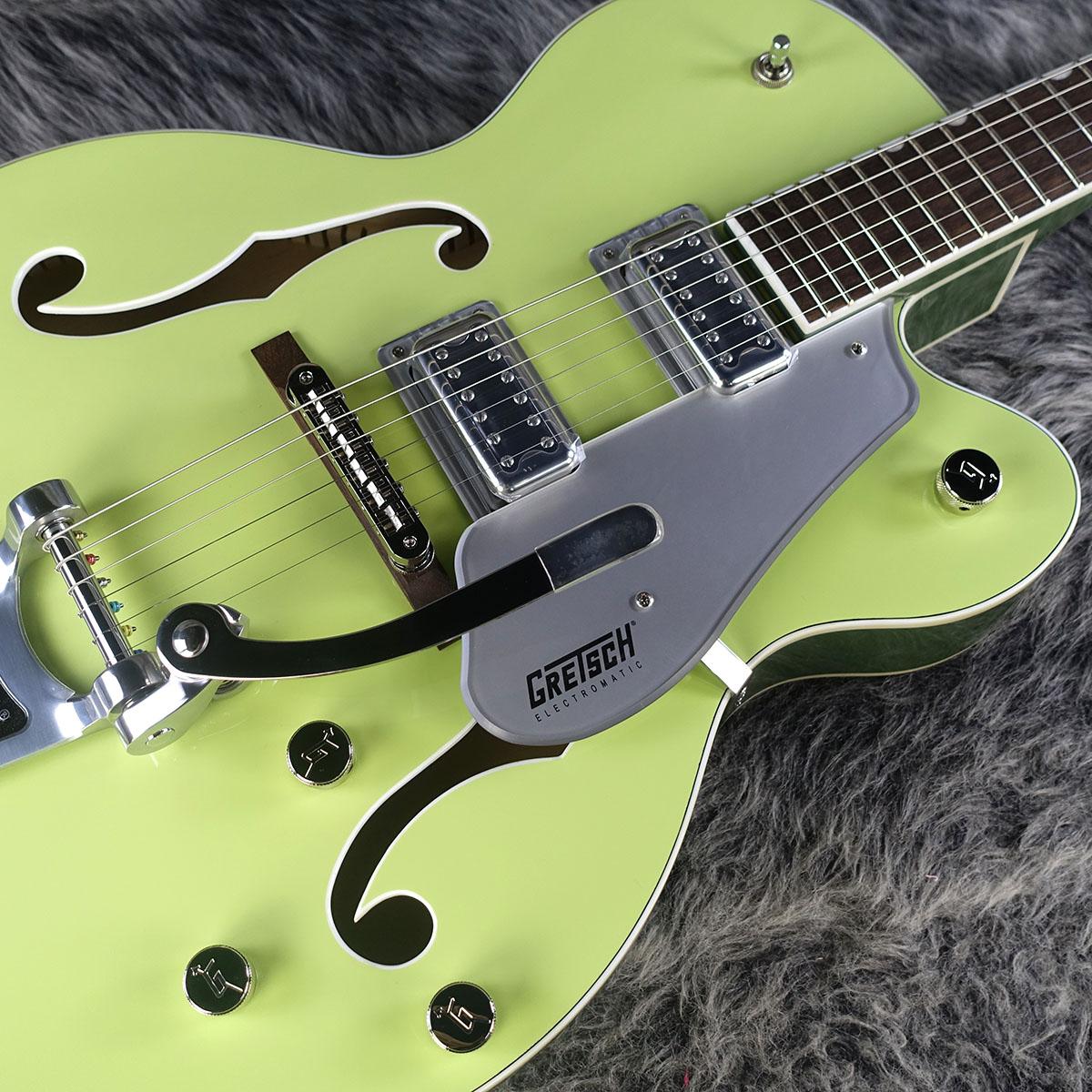 G5420T Electromatic Classic Hollow Body Single-Cut with Bigsbyは、洗練されたアーチ構造と、フィードバックを抑制するトレッスルブロックブレーシングを備えた、ヴィンテージギターにインスパイアされた外観のラミネートメイプルボディを採用しています。