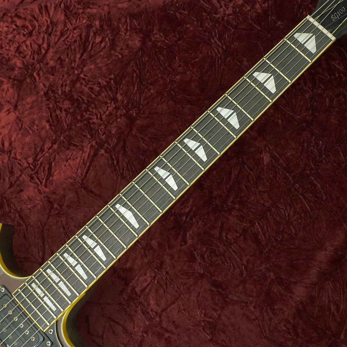 当時のカタログより、メイプルトップにナトーボディ、ローズ指板/マホガニーネックをセットネックジョイント。