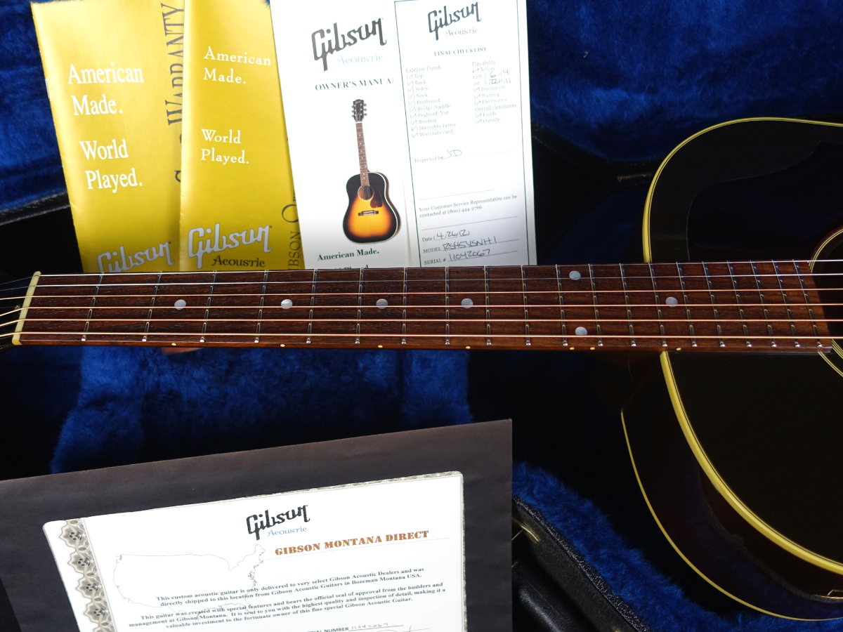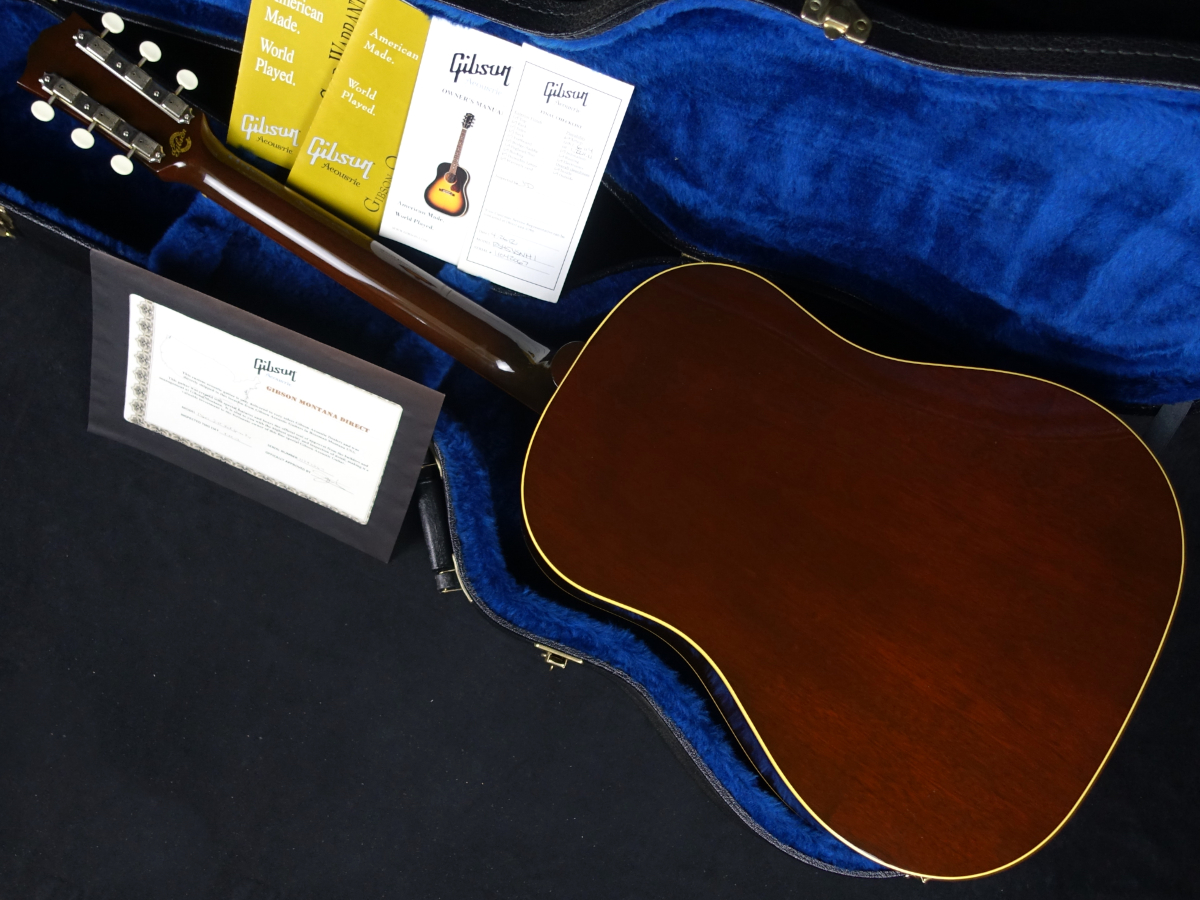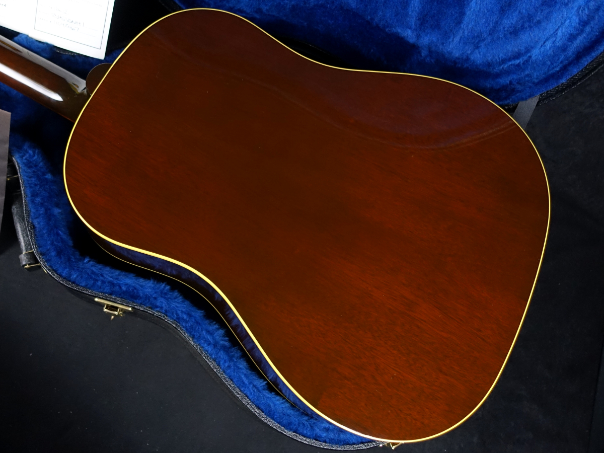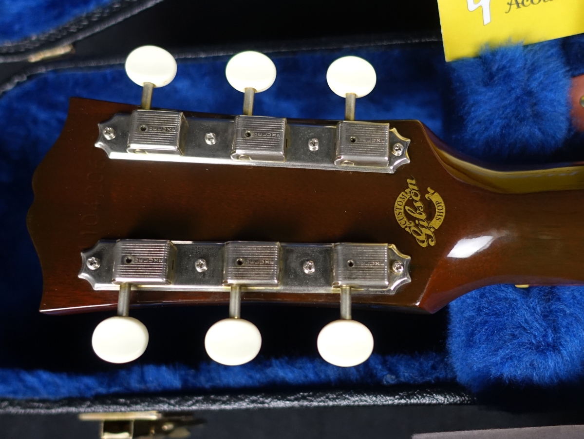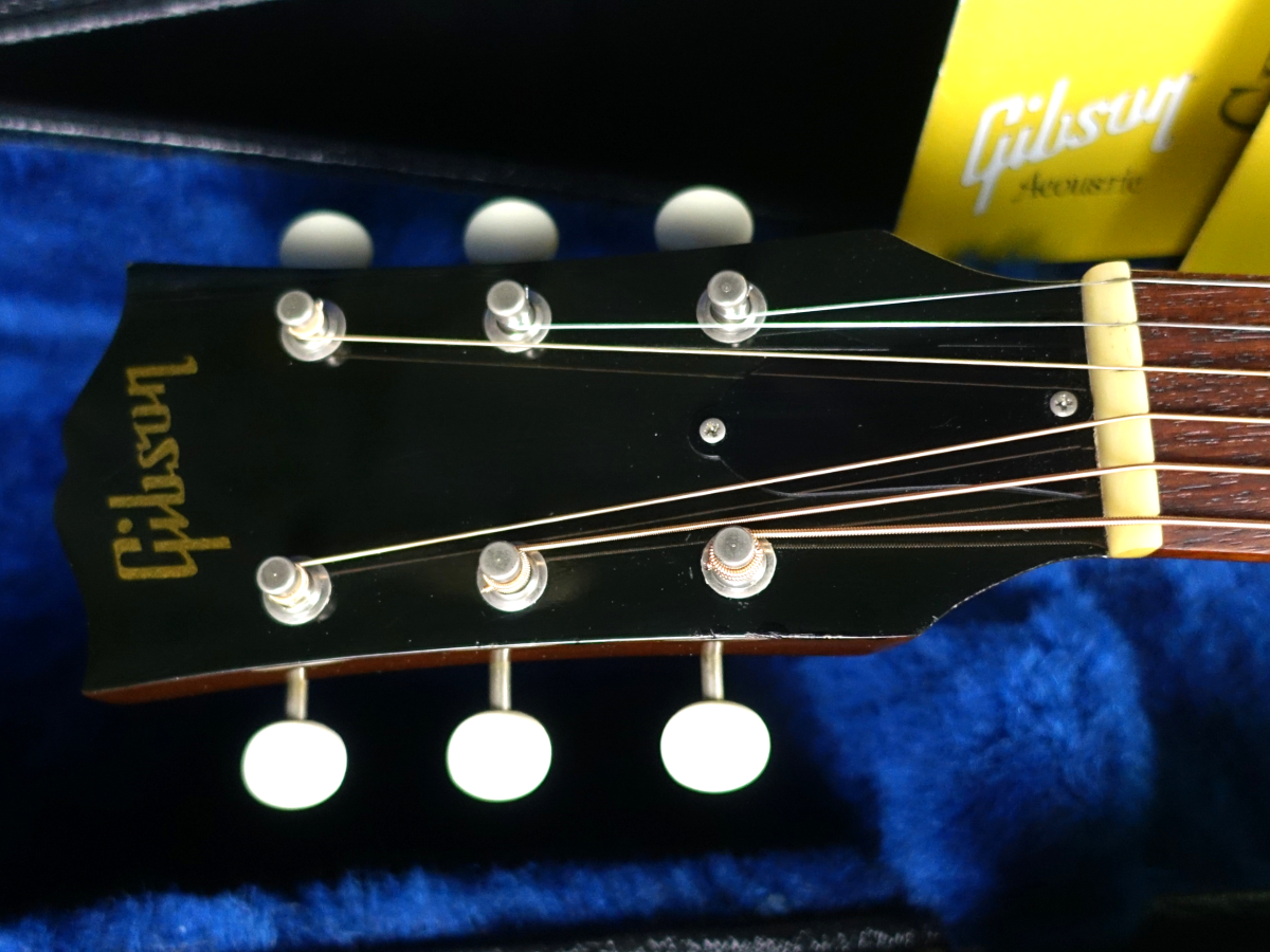 お馴染みジャンボ・ボディに、白ボタンのクルーソン3連スタイルペグ仕様、ラージピックガード、ストレートサドル、サウンドホールに7連のマルチロゼッタが施された仕様となっており、60年代の特徴的な仕様をしっかりと踏襲しています。