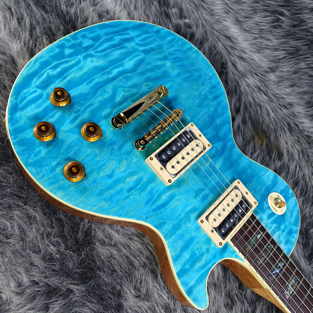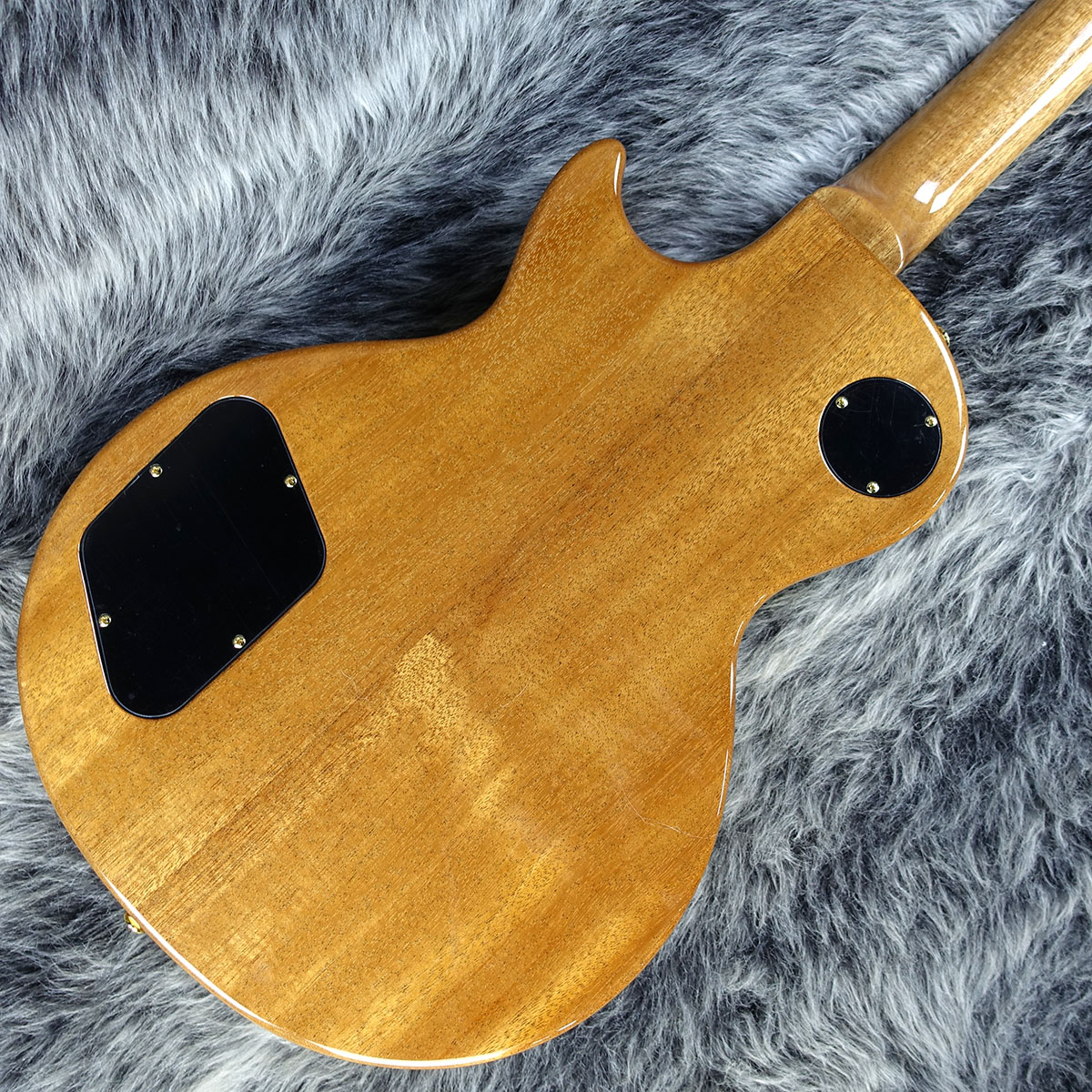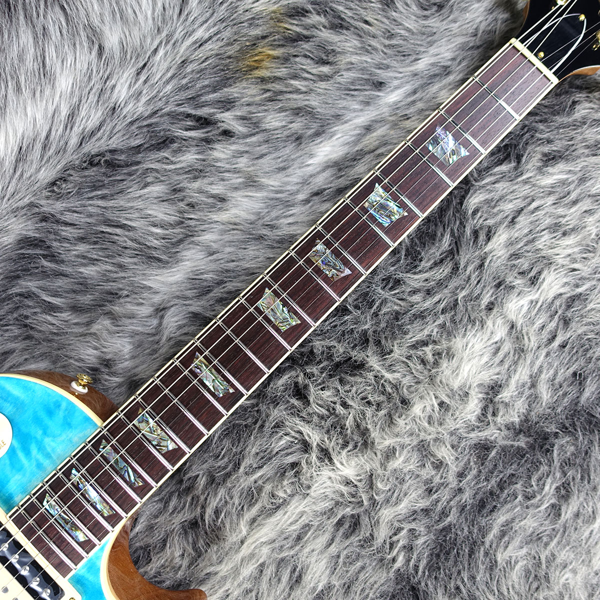 美しい杢目のキルトメイプルトップ、マホガニーバック、1Pマホガニーネック、ローズウッド指板のウッドマテリアル。