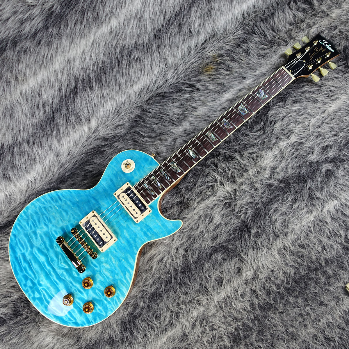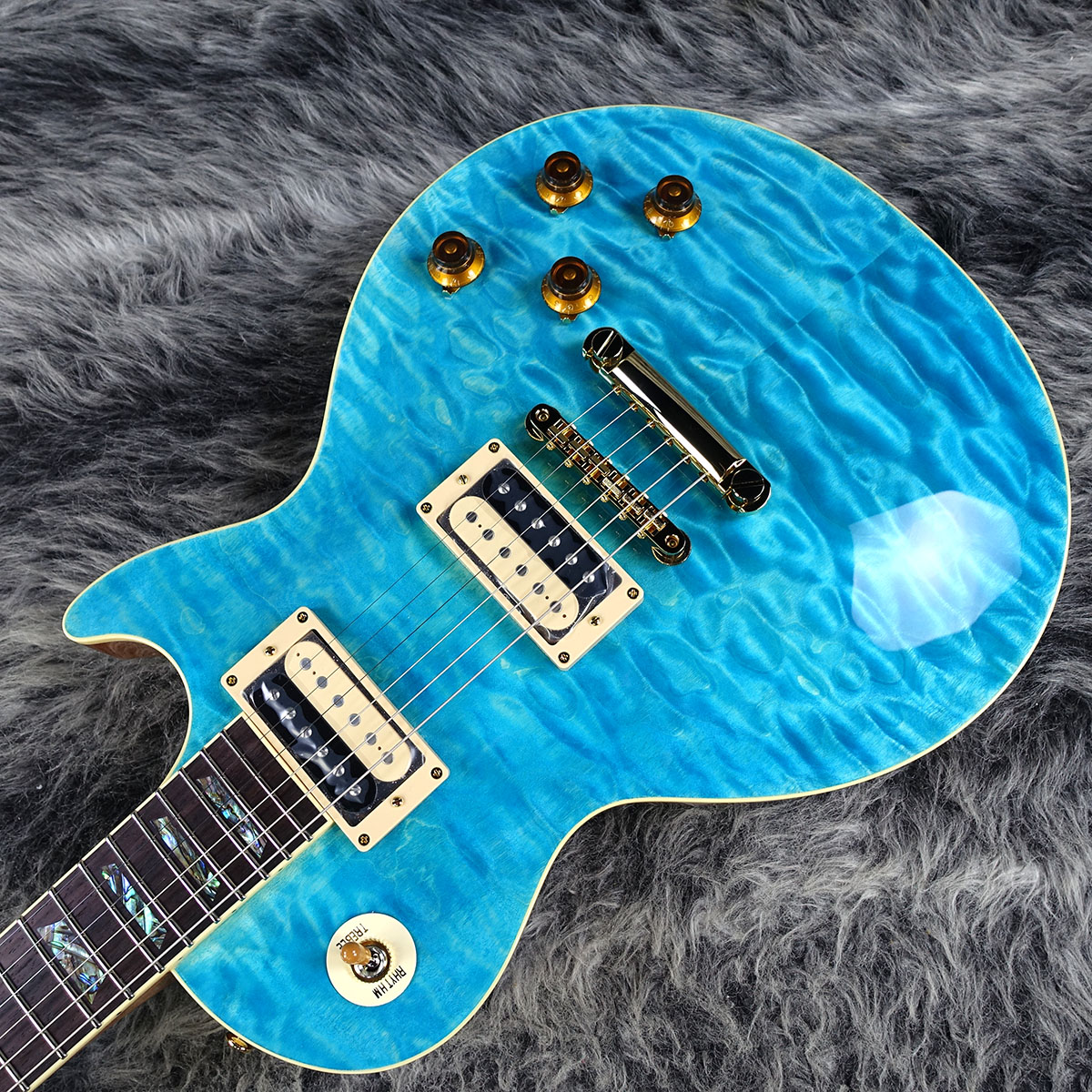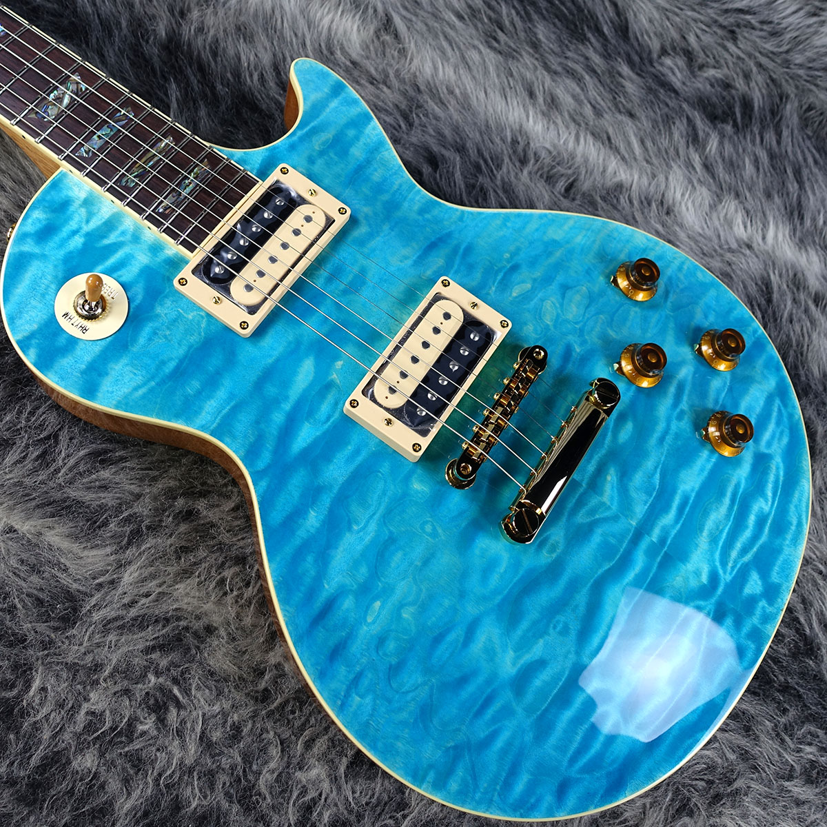 美しい杢目のキルトメイプルトップ、マホガニーバック、1Pマホガニーネック、ローズウッド指板のウッドマテリアル。