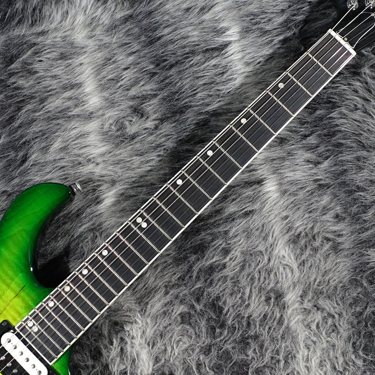 Victory Figured Topのスケールは25.5インチで、マホガニー・ネックは演奏性を高めるコンパウンド・ラジアス、スリムテーパー・プロファイル、24個のミディアム・ジャンボ・フレットにエボニー指板を採用しています。
