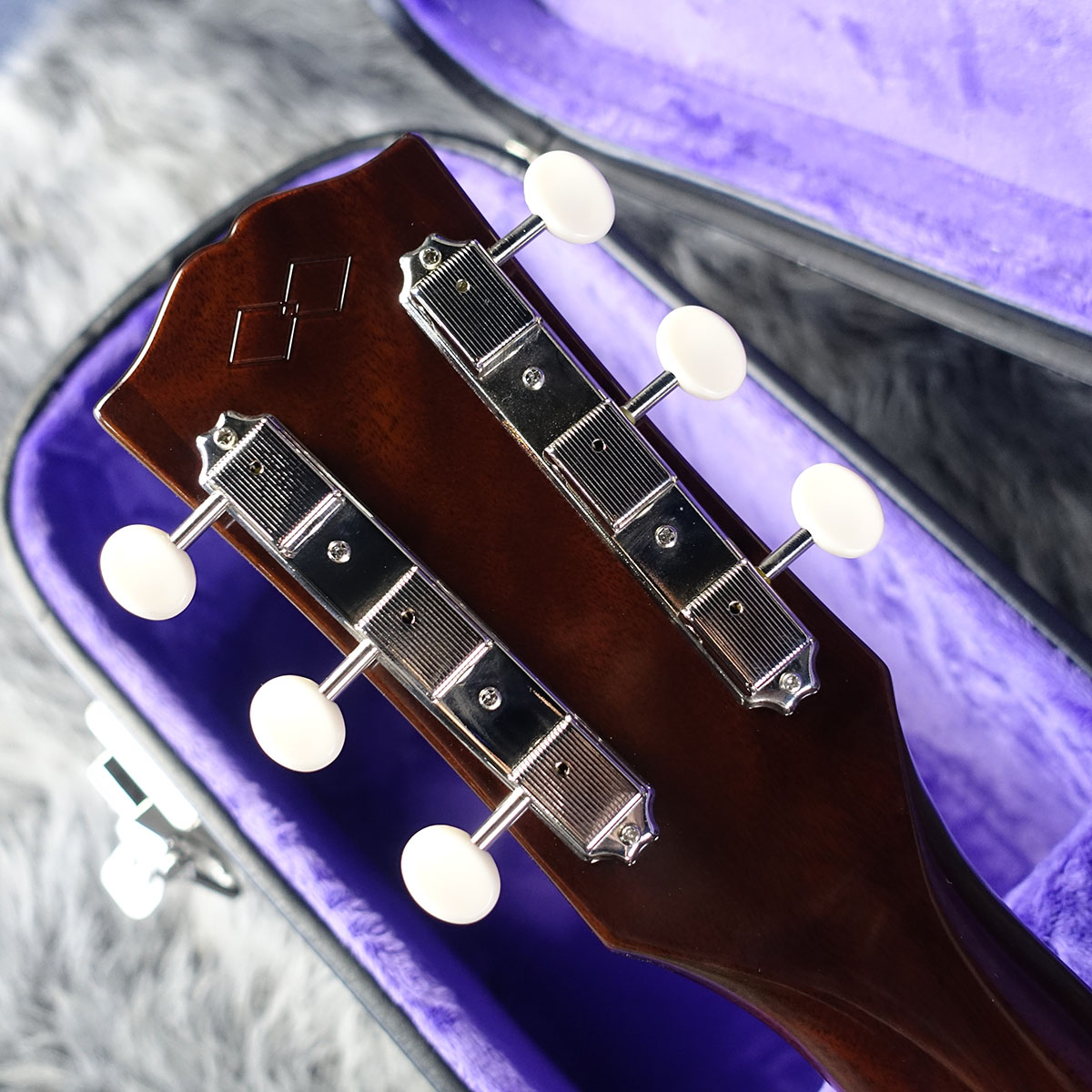 その他、ミディアム・フレットによる19フレット仕様のローズウッド指板には、マザー・オブ・パールのドット・ポジションマーク・インレイがあしらわれ、ローズウッドのレクタンギュラー・ブリッジ上のサドル、ナットとブリッジ・ピンには、それぞれボーン材を使用しています。